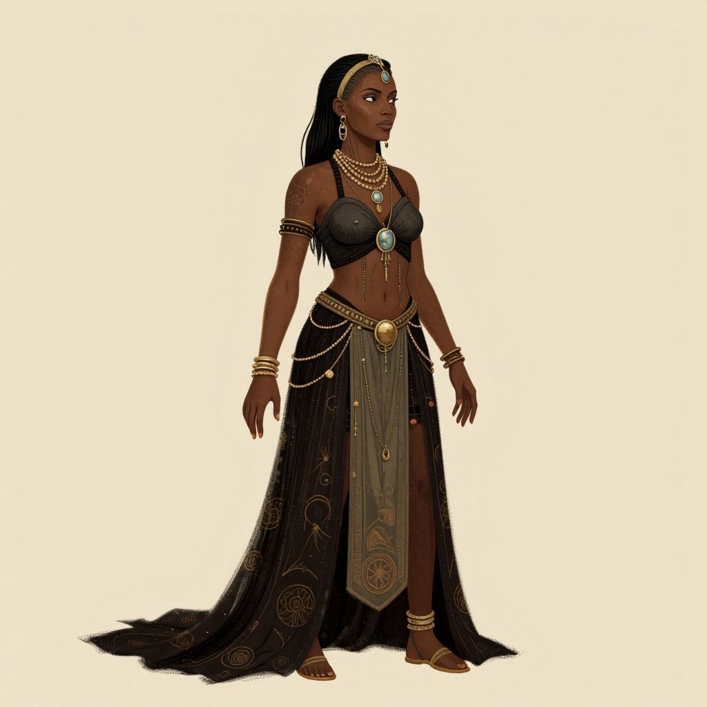 A black woman faun hybrid, 45 years old, maenad, prowler, decopunk, orientalist style, full length, illustration.
