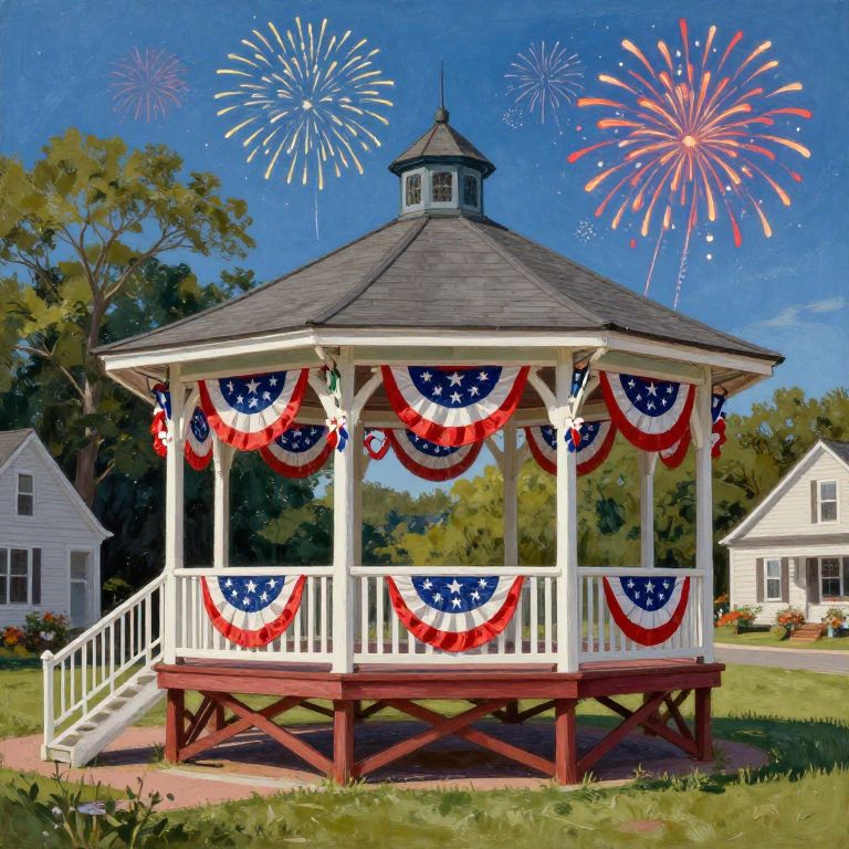 Retro Trends folk art painting of the Old Saybrook Connecticut town green bandstand decorated for the Fourth of July, style of Warren Kimble, fireworks, Americana,