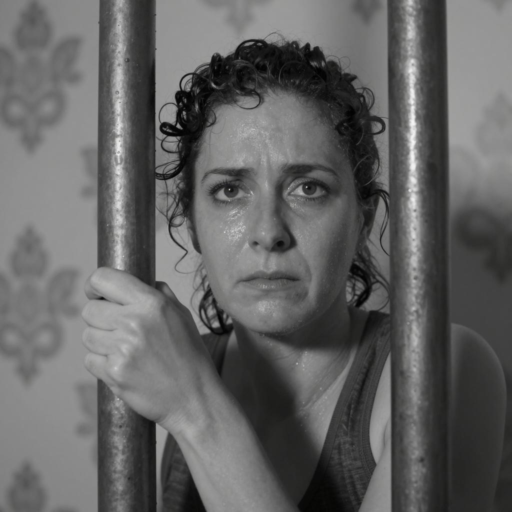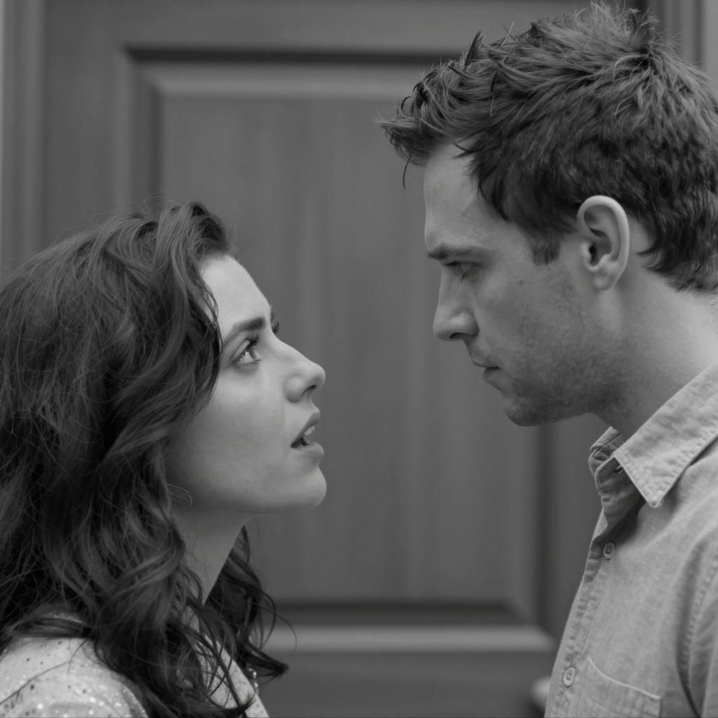 Black-and-white photograph of a woman with dark curly hair, wearing a light shirt, holding a man in a dark hat and jacket. Large, illuminated clock with Arabic numerals in background. Woman's intense, worried expression. Man's head bowed. Clock hands pointing right.