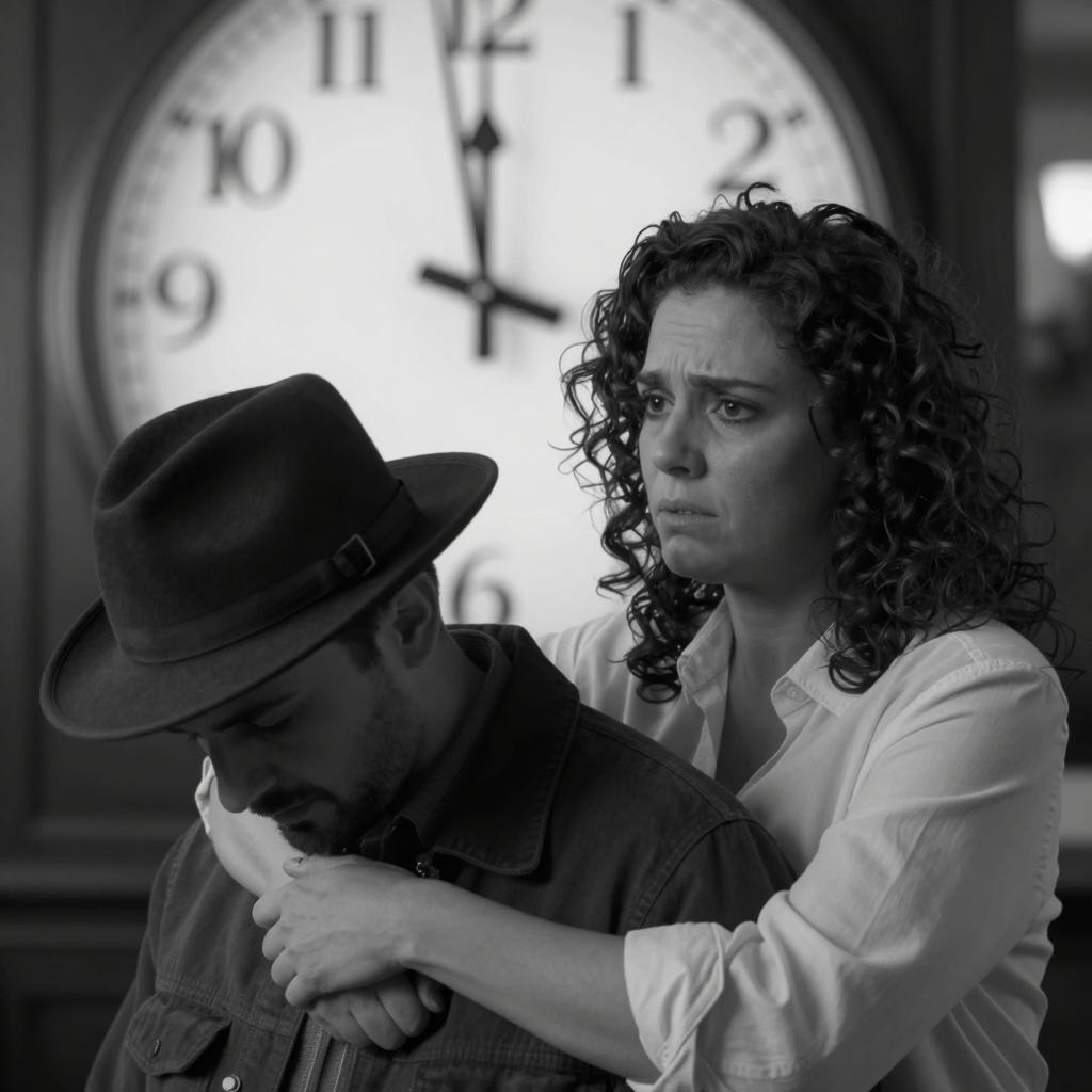 Black-and-white photo of a woman with dark curly hair wearing a light-colored shirt, holding and comforting a man dressed in a dark hat and jacket. The man's head is bowed, and the woman's expression is intense and worried. A large illuminated clock with Arabic numerals is visible in the background, its hands pointing towards the right side of the image.