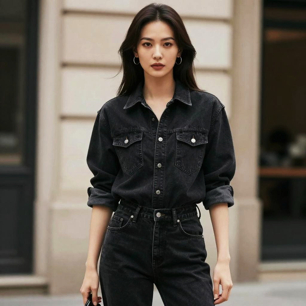 A confident woman wearing a stylish all-black denim outfit, featuring a black denim shirt with rolled-up sleeves and matching black jeans. The cinematic realism style emphasizes natural lighting and sharp details, highlighting her poised expression and casual yet fashionable look.