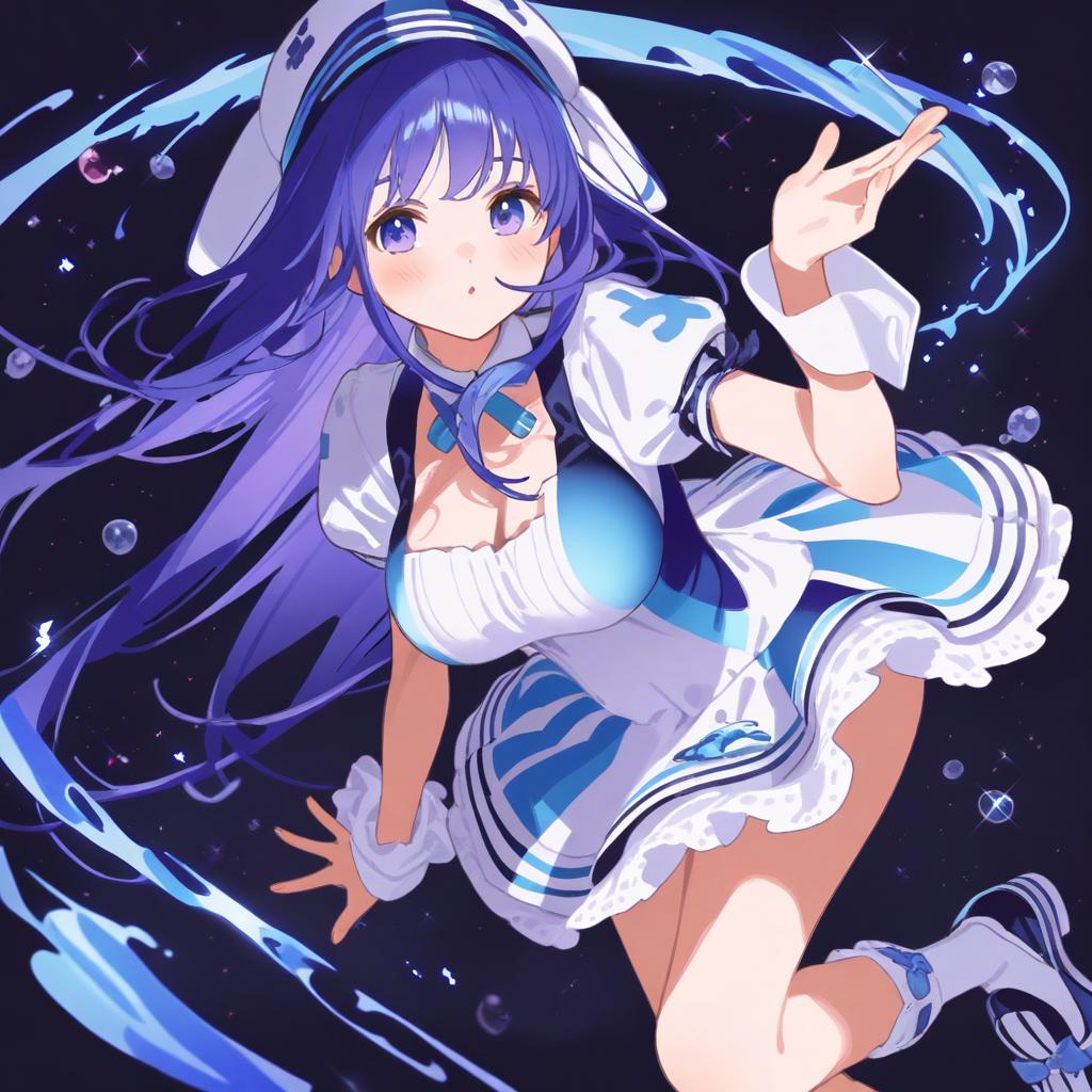 Arin, pangya, 1girl, blue eyes, purple eyes, long hair, blue hair, large breasts, by artist anbe yoshirou, animagine