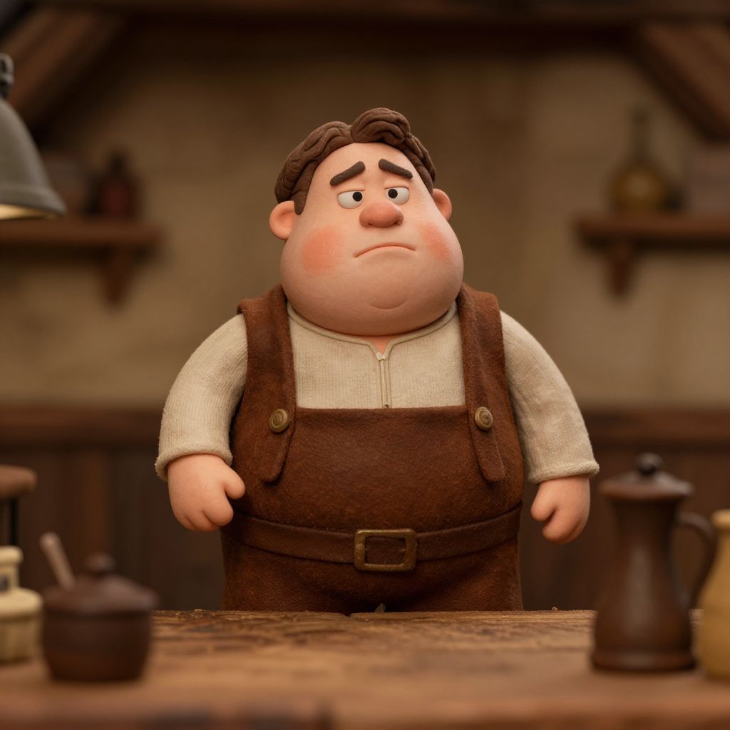 3D CGI image of a chubby, sad-looking man with short brown hair, wearing brown overalls and white shirt, standing in a rustic kitchen.