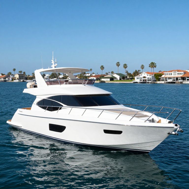 Photograph of a sleek, white, luxury yacht cruising on clear, blue water under a bright, cloudless sky. The yacht has a modern design with a curved roof and large, tinted windows. In the background, there's a coastal shoreline featuring palm trees and several white, two-story houses with red-tiled roofs. The yacht's wake creates gentle ripples in the water. The image has high contrast and vivid colors, emphasizing the yacht's polished surface and the vibrant blue of the sea and sky.