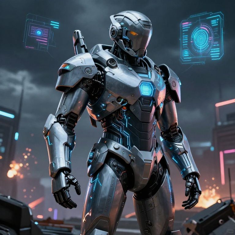 A CGI-rendered image of a futuristic, silver robotic warrior standing in a dark, neon-lit urban battlefield. The robot has a sleek, metallic body with glowing blue accents and yellow eyes. It has a muscular build with detailed armor plating on its arms, chest, and legs. In the background, tall buildings with colorful neon lights are visible, along with faint explosions and smoke. Two holographic interfaces float above the robot's shoulders, displaying blue and purple circuitry patterns. The overall scene has a cyberpunk aesthetic with a dramatic, high-tech atmosphere.