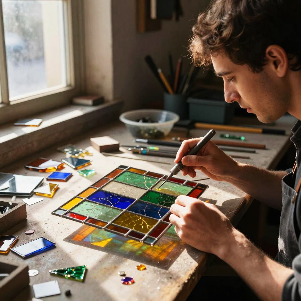 Stained glass creator at work in an old artisan studio, surrounded by glass shards in every hue, carefully soldering lead came to assemble a luminous panel, warm sunlight streaming through a dusty window, emphasizing texture and depth of glass art.
