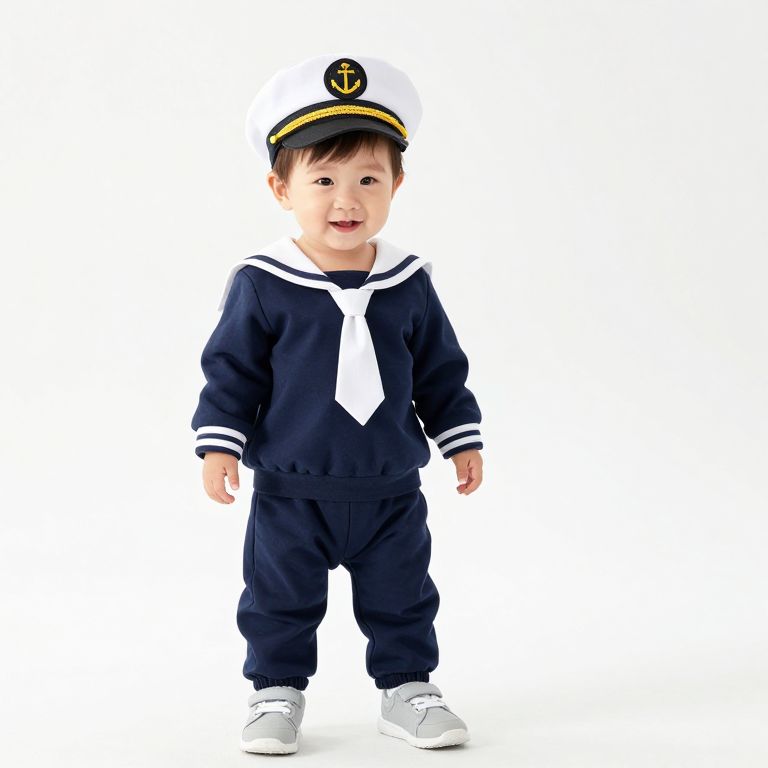 Adorable toddler boy wearing a navy sailor outfit, complete with a white captain's hat featuring a gold anchor emblem, a matching navy long-sleeve shirt with white trim and tie, navy pants, and gray sneakers, exudes charm and joy against a clean white background.