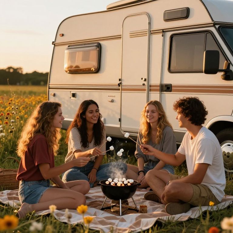 Photograph of four young adults, two women and two men, sitting on a checkered blanket in a sunlit meadow with yellow wildflowers. They are gathered around a small, black, metal campfire pit with white embers. The background features a white and brown-striped RV. The women have long, wavy brown and blonde hair, wearing casual outfits like t-shirts and shorts. The men have curly brown hair, one in a white t-shirt and beige shorts, the other in a maroon t-shirt and denim shorts. They are smiling and engaged in conversation, creating a warm, relaxed atmosphere. The sky is clear, suggesting a late afternoon setting.