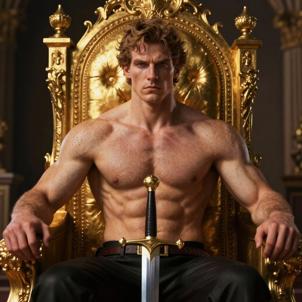 Photograph of a muscular, shirtless man with curly brown hair and fair skin, sitting on an ornate, golden throne with intricate carvings. He has a stern expression, with defined abs and broad shoulders. A black-hilted sword with a golden hilt rests vertically in front of him, its blade pointing down. He wears black pants with a gold belt. The background is dimly lit, highlighting the shiny, gold throne against a dark setting. The lighting emphasizes his muscular physique and the throne's luxurious details.