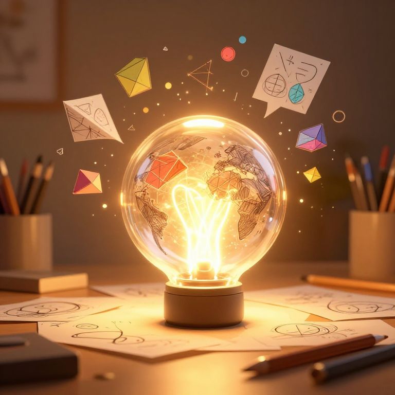 Dynamic scene of a draw idea generator as a glowing orb hovering above an artist's desk, radiating colorful thoughts and ideas represented by floating geometric shapes and sketches, warm golden lighting, hyper-realistic style with high detail