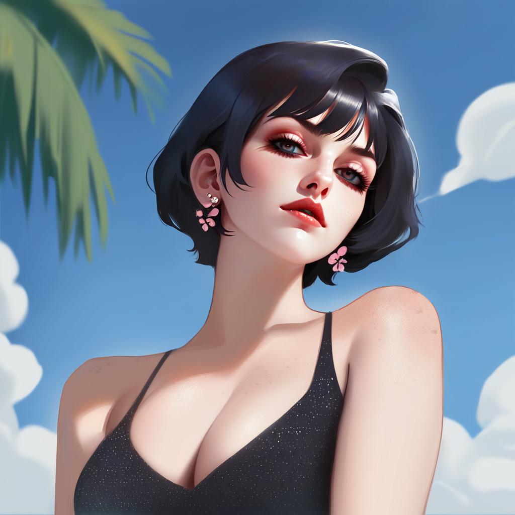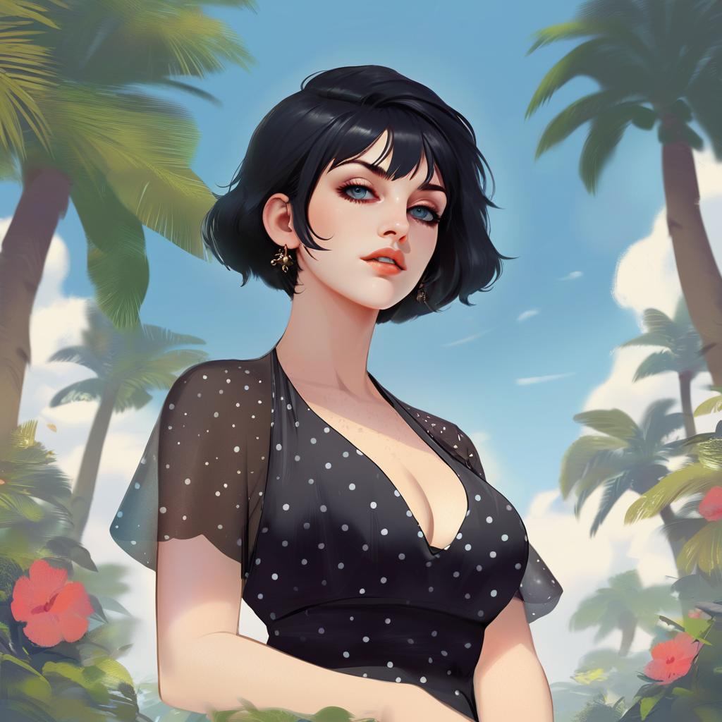 Digital artwork of a young woman with short black hair and freckles wearing a black polka dot dress with sheer sleeves. She is standing outdoors surrounded by palm trees and tropical flowers under a partly cloudy blue sky. She has red lips, subtle makeup, and is accessorized with earrings.