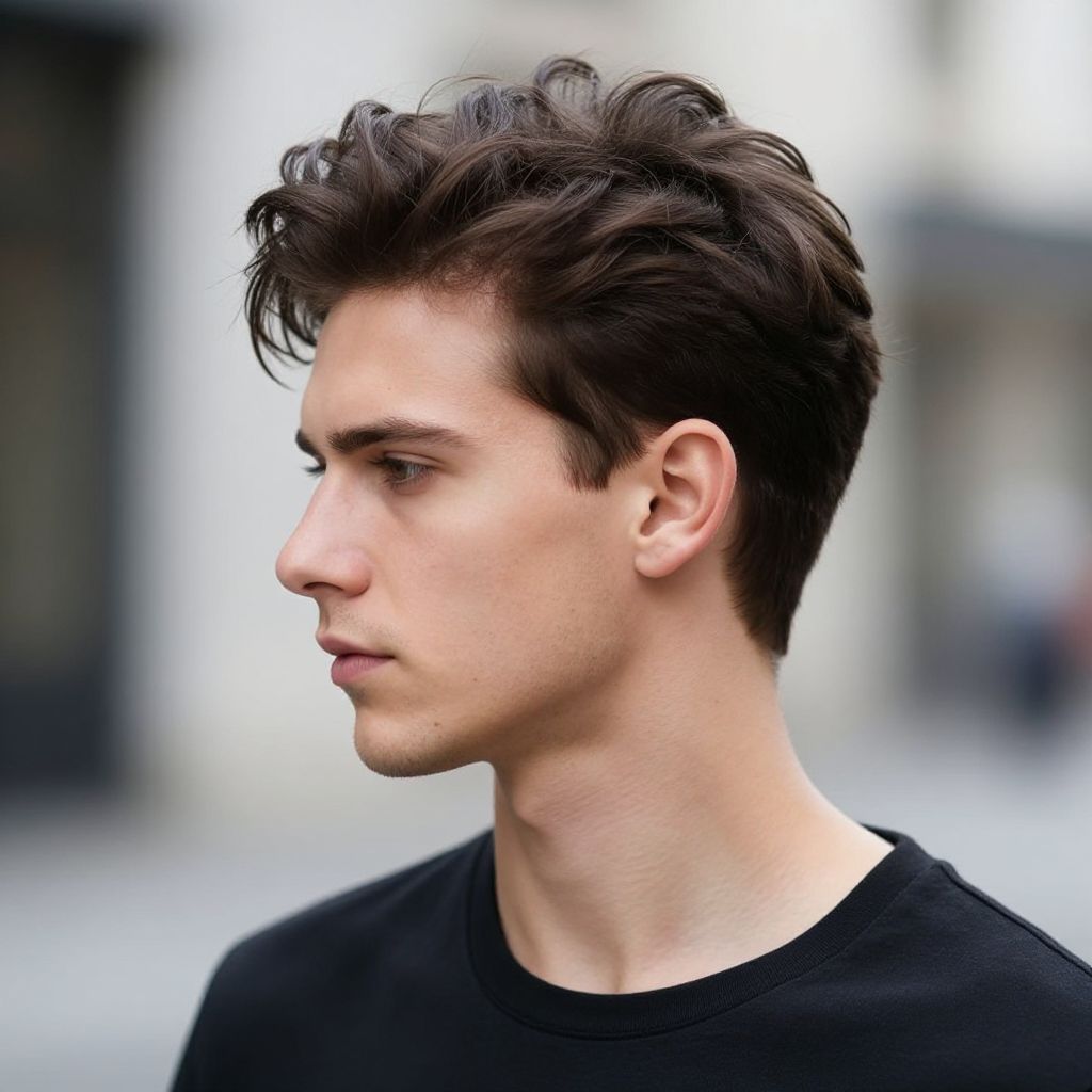 Short Blowout, fit european man, lifestyle portrait, realistic photography, city background, relaxed yet stylish pose, modern haircut, high resolution, detailed skin texture, natural lighting
