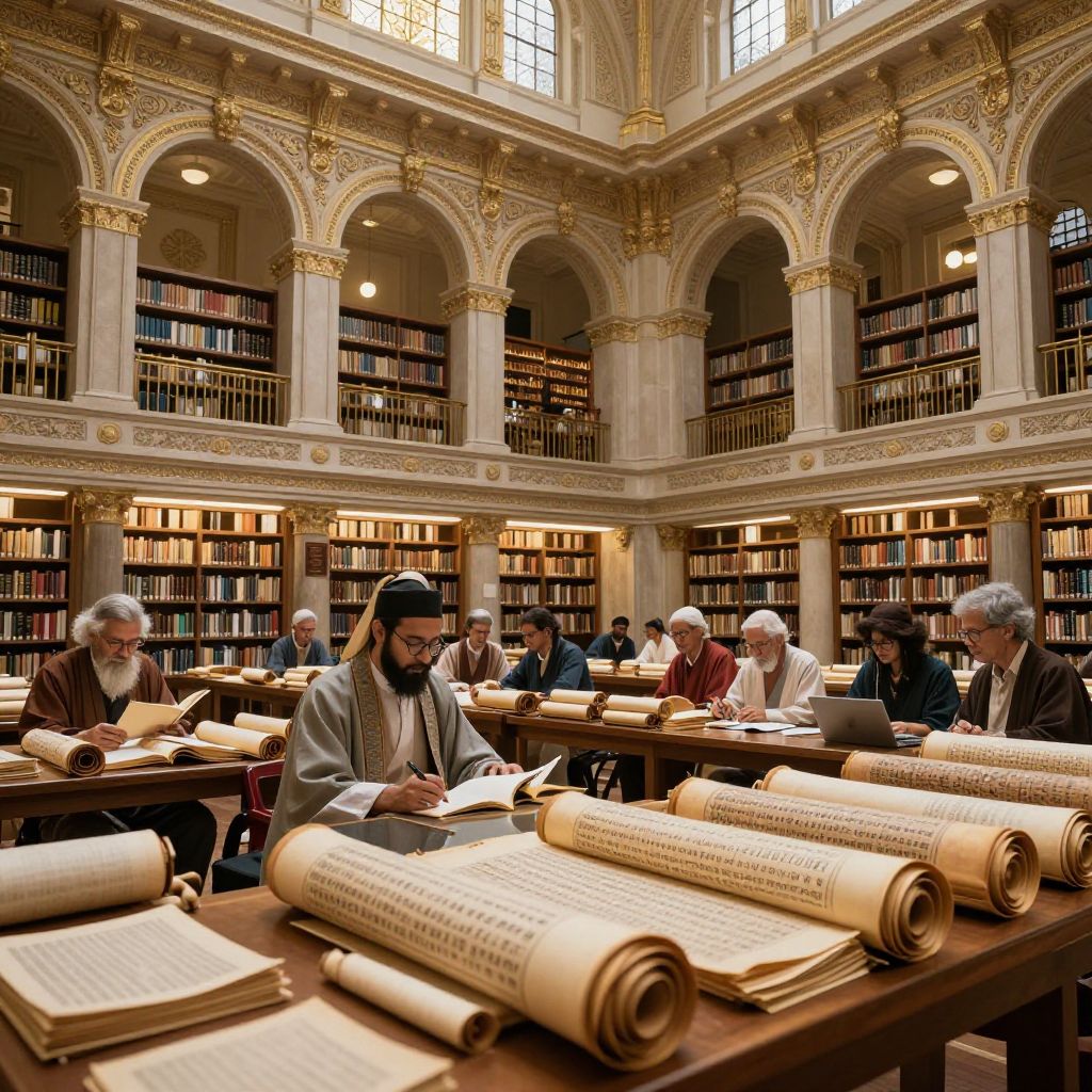 Culturally advanced library blending ancient scrolls and digital archives, grand hall with ornate designs, scholars in varied traditional and modern clothing, soft golden light ambiance