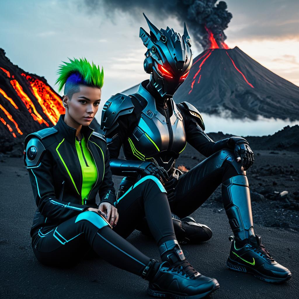 Functional Art photo of an attractive galactic bounty hunter duo sitting beside a black robotic tiger with icy gray eyes, on the left side is a random sapphire robot beast with magenta eyes, the woman is looking into the lens, woman has spiky silver hair and wears a black tactical body fit suit, full body picture, editorial style, man wears a dark blue armor plating suit, natural face, active volcano and lava in the background, fog, golden hour, cinematic, futuristic, hyperrealistic.