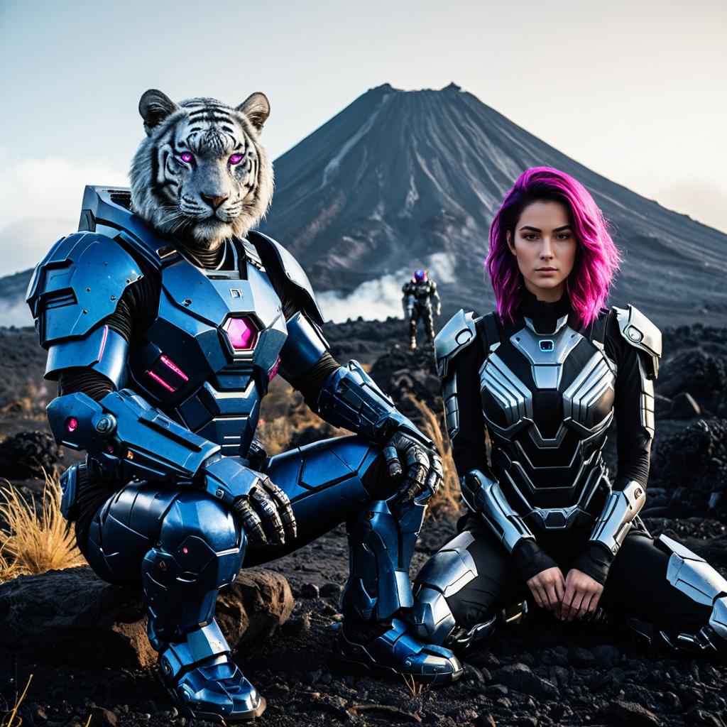 A hyperrealistic image of a galactic bounty hunter duo in advanced armor plating suits sitting beside a robotic tiger with icy gray eyes. The man on the left is in a dark blue armored suit with magenta accents and a tiger head helmet, while the woman on the right wears a silver and black tactical bodysuit, sporting spiky magenta hair. They are positioned in a rugged volcanic landscape with an active volcano and lava in the background, under golden hour light with misty fog enhancing the cinematic atmosphere.