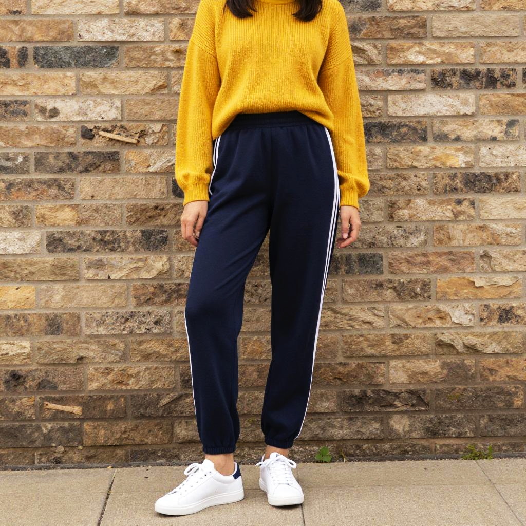 A fashionable woman stands confidently against a textured brick wall, showcasing a trendy casual outfit featuring a vibrant yellow sweater and navy track pants. Her relaxed style is complemented by white sneakers, making it perfect for everyday wear.