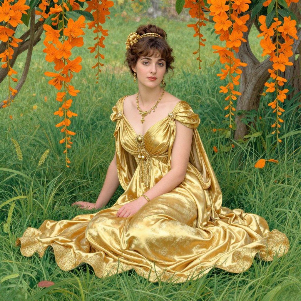 A digital illustration of a fair-skinned woman with dark curly hair, wearing a golden, off-shoulder, satin gown with intricate embroidery. She sits gracefully in a lush green meadow, surrounded by vibrant orange flowers hanging from trees on both sides. She has a delicate gold headband, necklace, and earrings, with a subtle smile. The background features tall grass and a blurred, sunlit forest. The overall style is realistic with a hint of fantasy, emphasizing the contrast between the bright gold of her dress and the vivid green and orange surroundings.