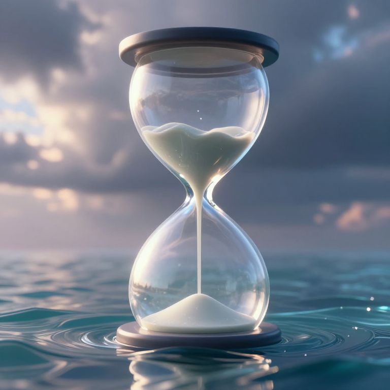 Photograph of a clear glass hourglass with a black cap, standing in calm, rippling blue water under a dramatic, cloudy sky. The hourglass contains white sand, slowly trickling from the top to the bottom. Light from the sun, partially obscured by clouds, illuminates the glass and creates reflections on the water's surface. The hourglass is centered in the image, with the water extending outwards and the sky in the background, blending shades of blue and gray.