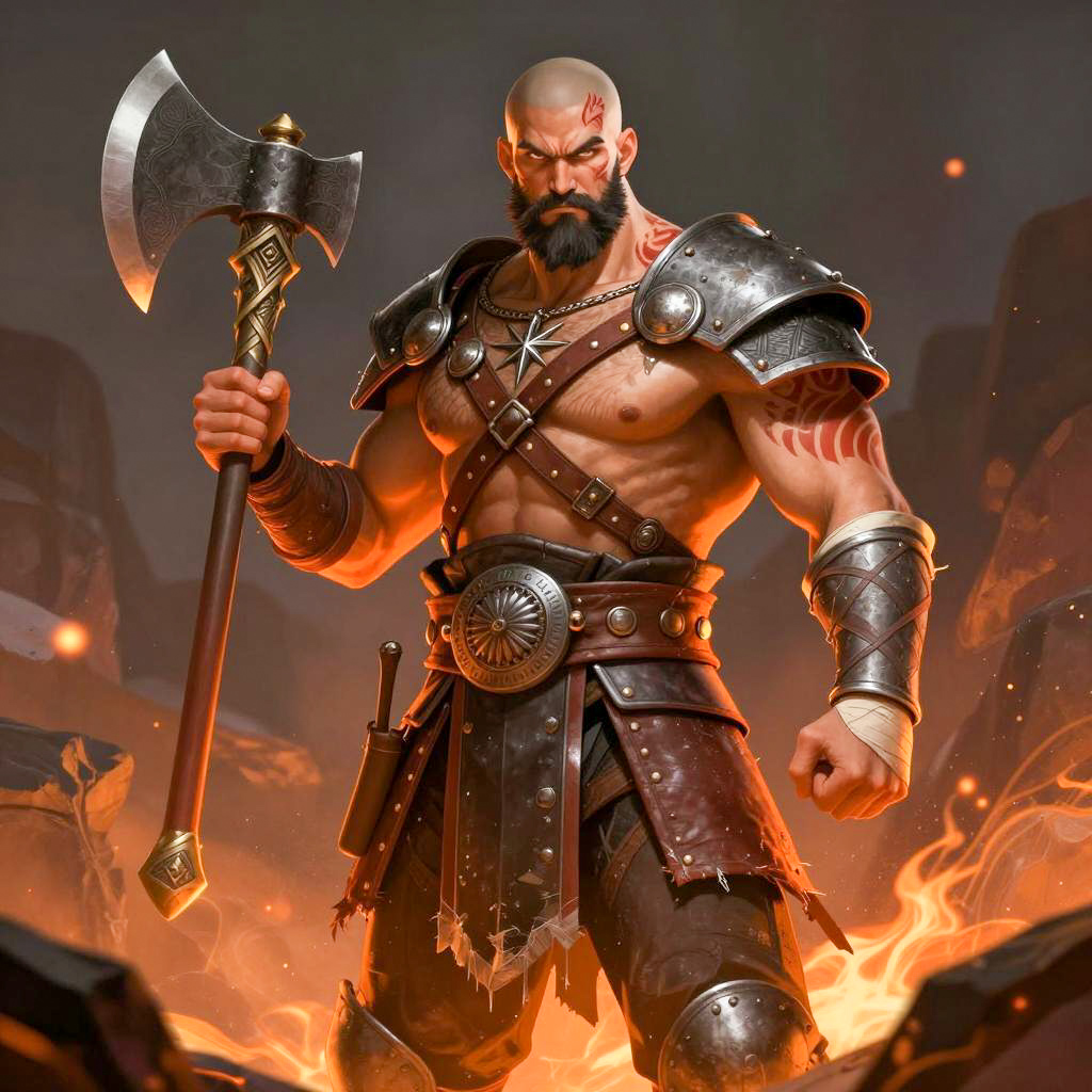 Digital illustration of a bald, muscular man with a black beard and red tribal tattoos. He wears a tattered, leather and metal armor, holding a large, ornate axe in his right hand. His left arm is wrapped in bandages. He stands on a rocky surface with glowing orange embers in the dark background. His expression is intense and fierce.