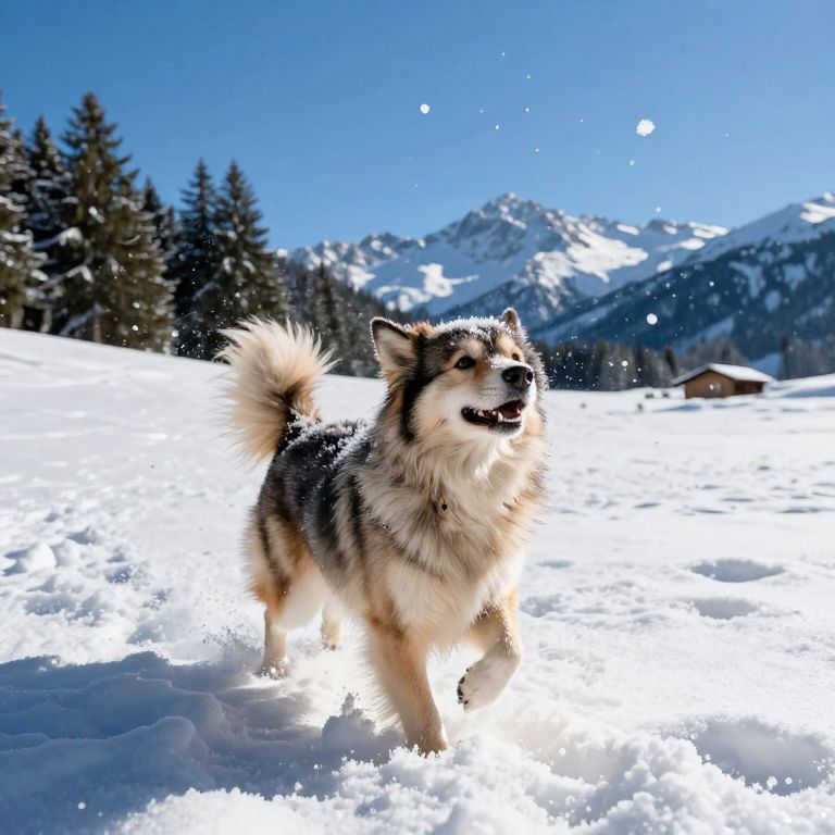 Photograph of a fluffy, medium-sized Siberian Husky with black, white, and brown fur, standing in a snowy landscape. The dog has a thick, bushy tail and is mid-step, with snowflakes around its head. Its tongue is slightly out and it looks happy and energetic. Behind the dog, there are snow-covered evergreen trees and a clear blue sky with snow-capped mountains in the distance. The bright sunlight casts sharp shadows, highlighting the dog's fur texture and the snow's sparkling surface. A wooden cabin is partially visible to the right.