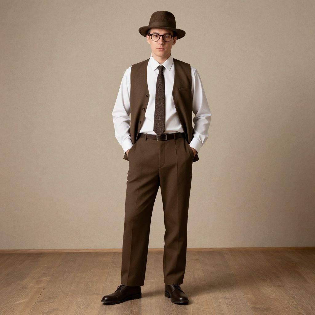 Retro Attire Man Costume, man in a hat and glasses standing with his hands in his pockets