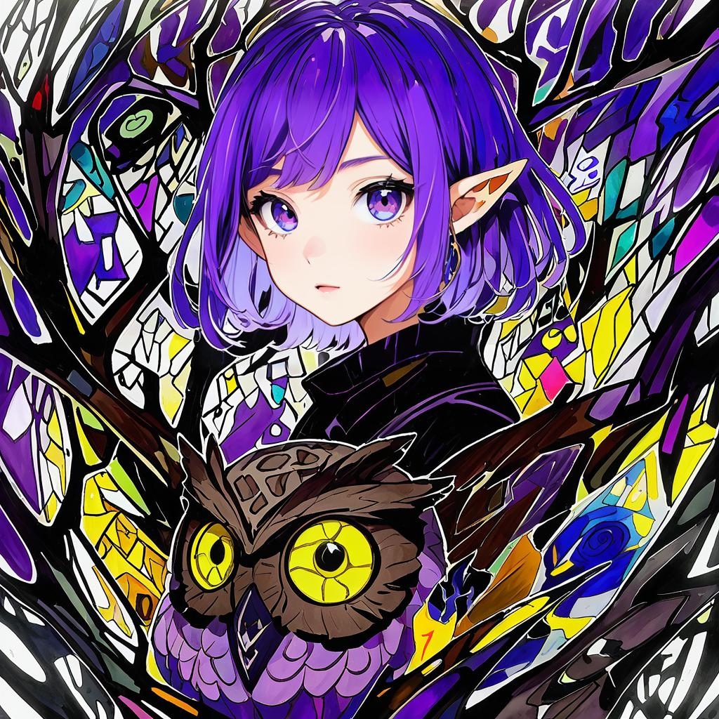 Anime style illustration featuring a girl with short, vibrant purple hair, large purple eyes, and pointy ears. She is depicted alongside a stylized owl with striking yellow eyes and brown and purple feathers. The background incorporates a colorful, stained glass-like abstract pattern in purple, yellow, and blue tones. The artwork is inspired by the character Amity Blight from The Owl House and is created in a detailed anime style reminiscent of artist Mika Pikazo.