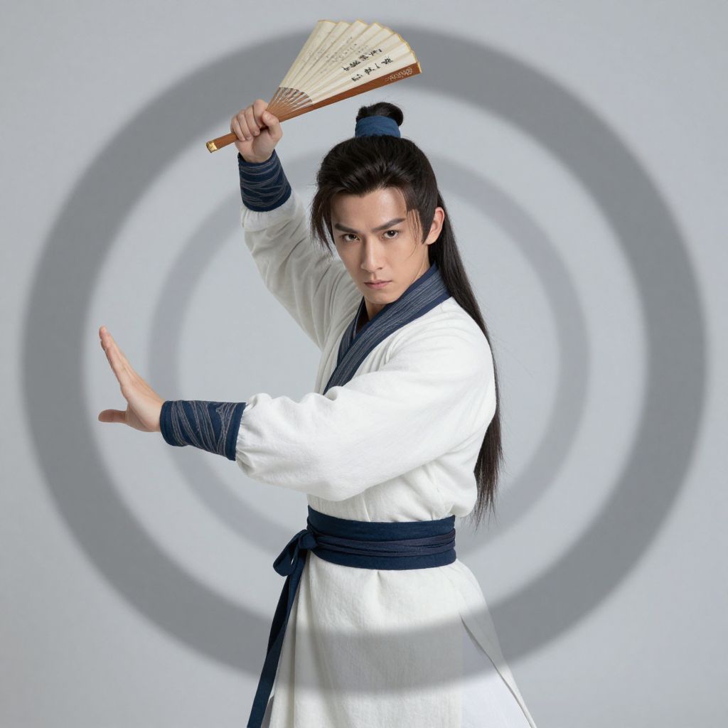 Trompe-LOeil /imagine A young swordsman from a Chinese martial arts novel, gracefully holding a fan, highly skilled in martial arts, and handsome. picture style,