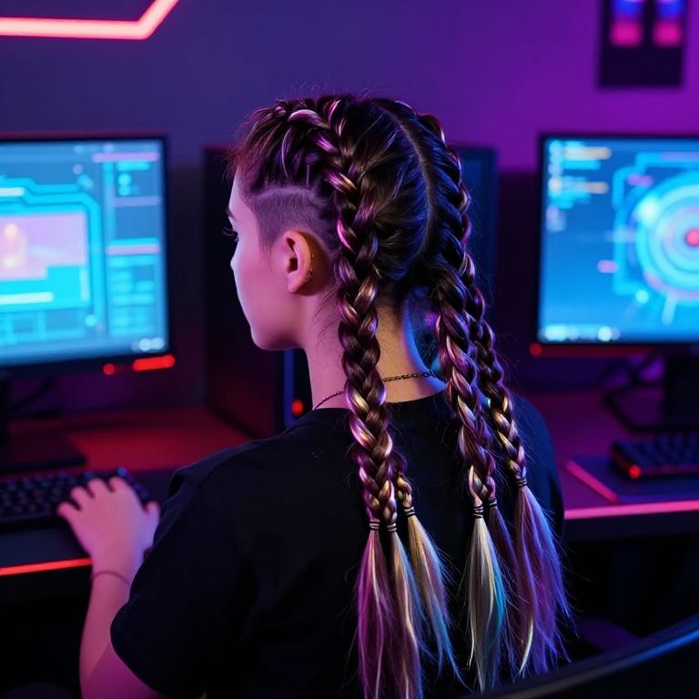 Gamer girl hairstyles with bold undercuts, long flowing braids, and glowing streaks, set in a high-tech gaming room filled with holographic displays and colorful RGB lighting, capturing the energetic spirit of a dedicated female gamer.