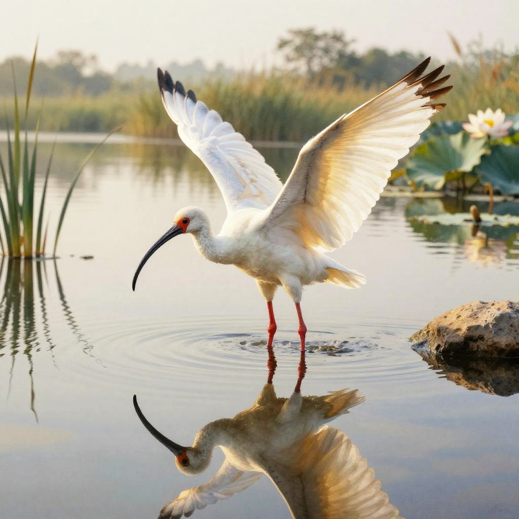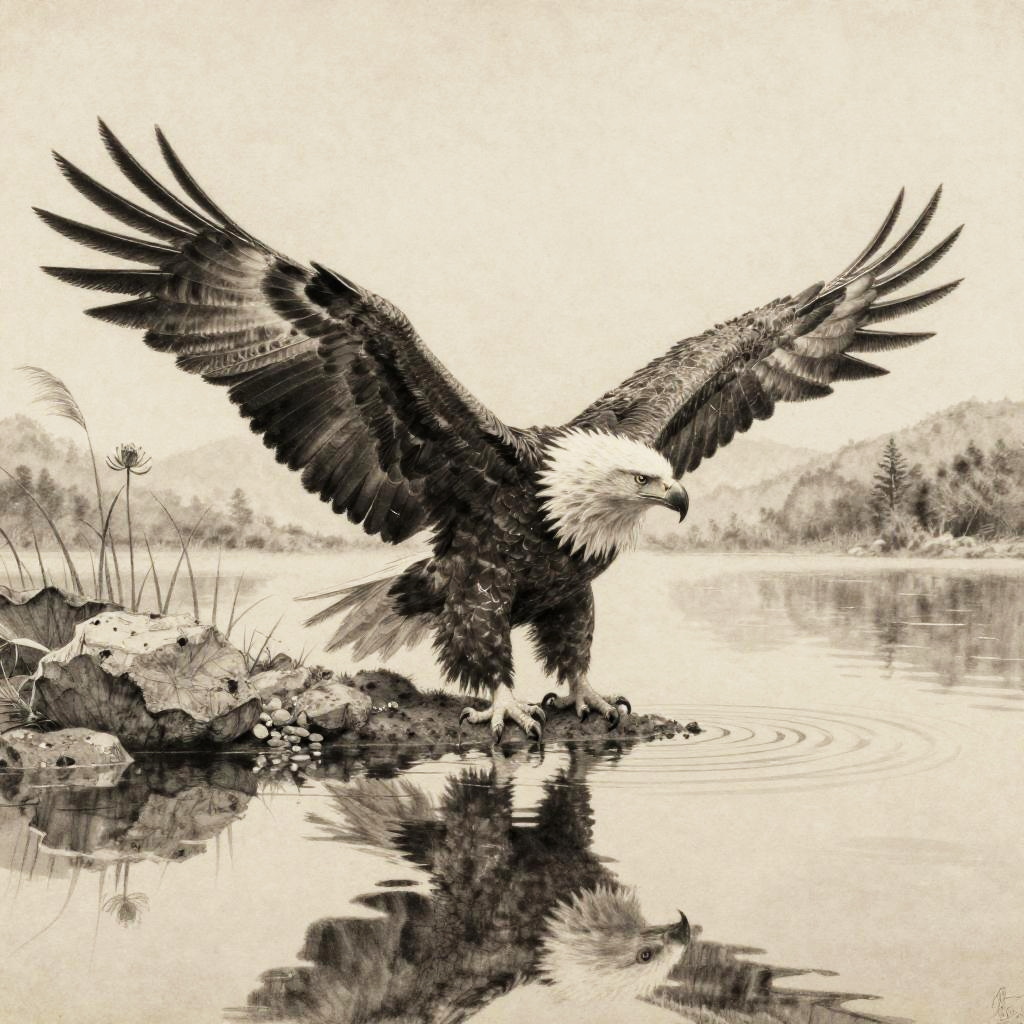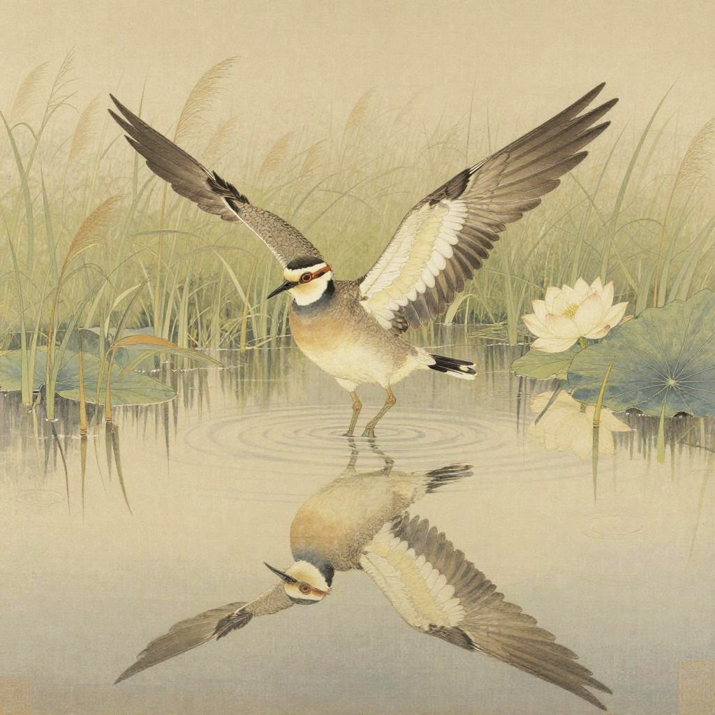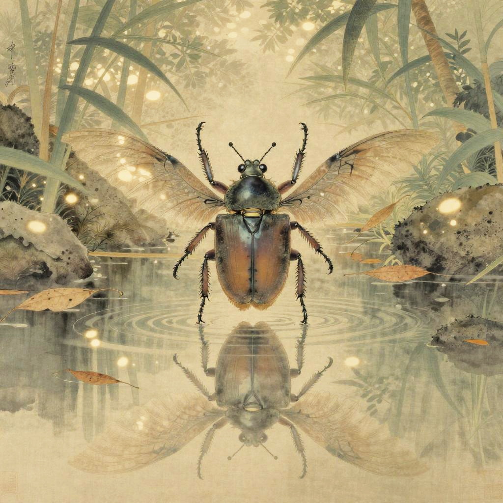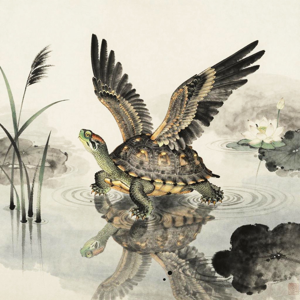Jade turtle in quiet oasis pond with lotus and reeds, calm water with ripples, full body and clear reflection, wings fully spread, intricate feather detail. Traditional media: Chinese ink and watercolor on rice paper. Solo, animal focus, no humans, signature. Natural elements like reeds, lotus, or rocks, balanced symmetry, soft haze, gentle vignette, fine paper texture, painterly strokes, subtle highlights, tranquil composition, serene atmosphere, natural lighting, museum print feel.