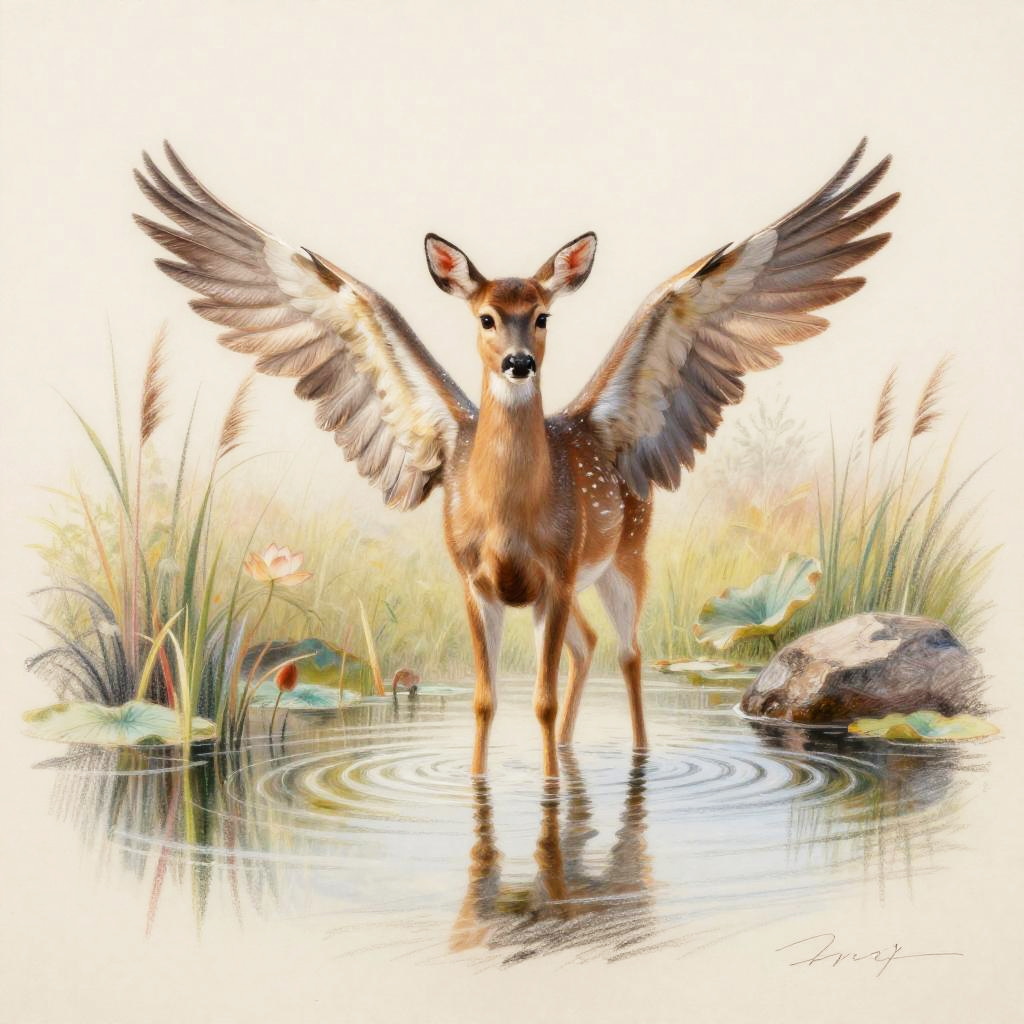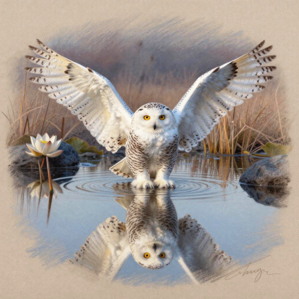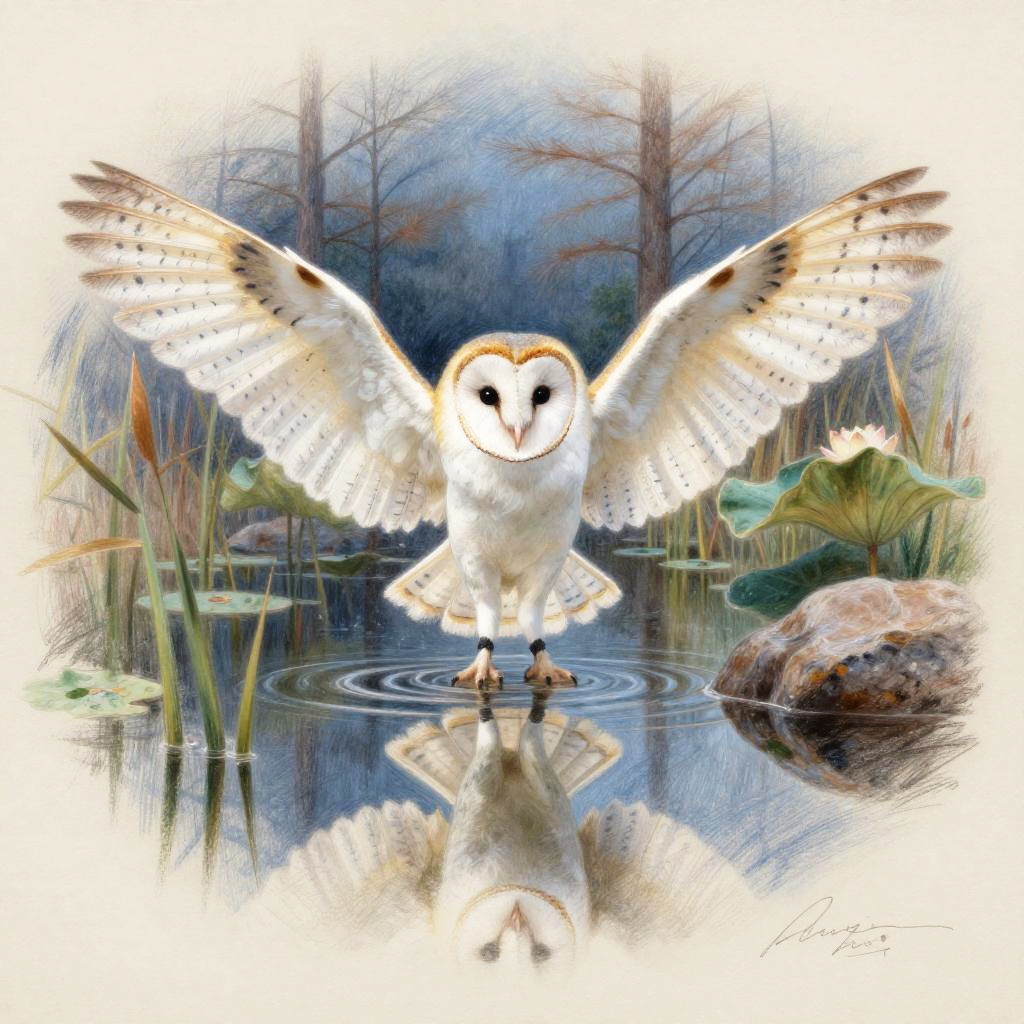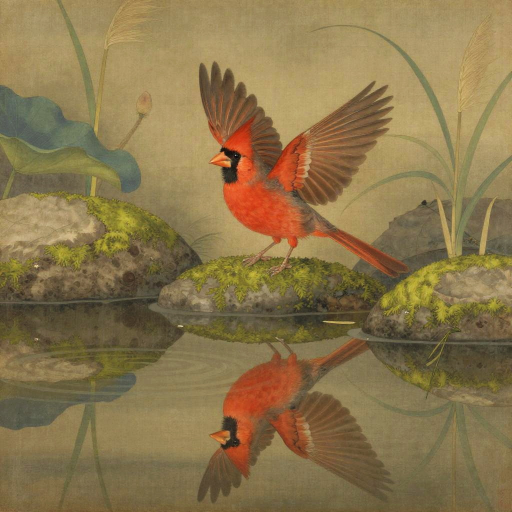 Jade turtle in quiet oasis pond with lotus and reeds, calm water with ripples, full body and clear reflection, wings fully spread, intricate feather detail. Traditional media: Chinese ink and watercolor on rice paper. Solo, animal focus, no humans, signature. Natural elements like reeds, lotus, or rocks, balanced symmetry, soft haze, gentle vignette, fine paper texture, painterly strokes, subtle highlights, tranquil composition, serene atmosphere, natural lighting, museum print feel.