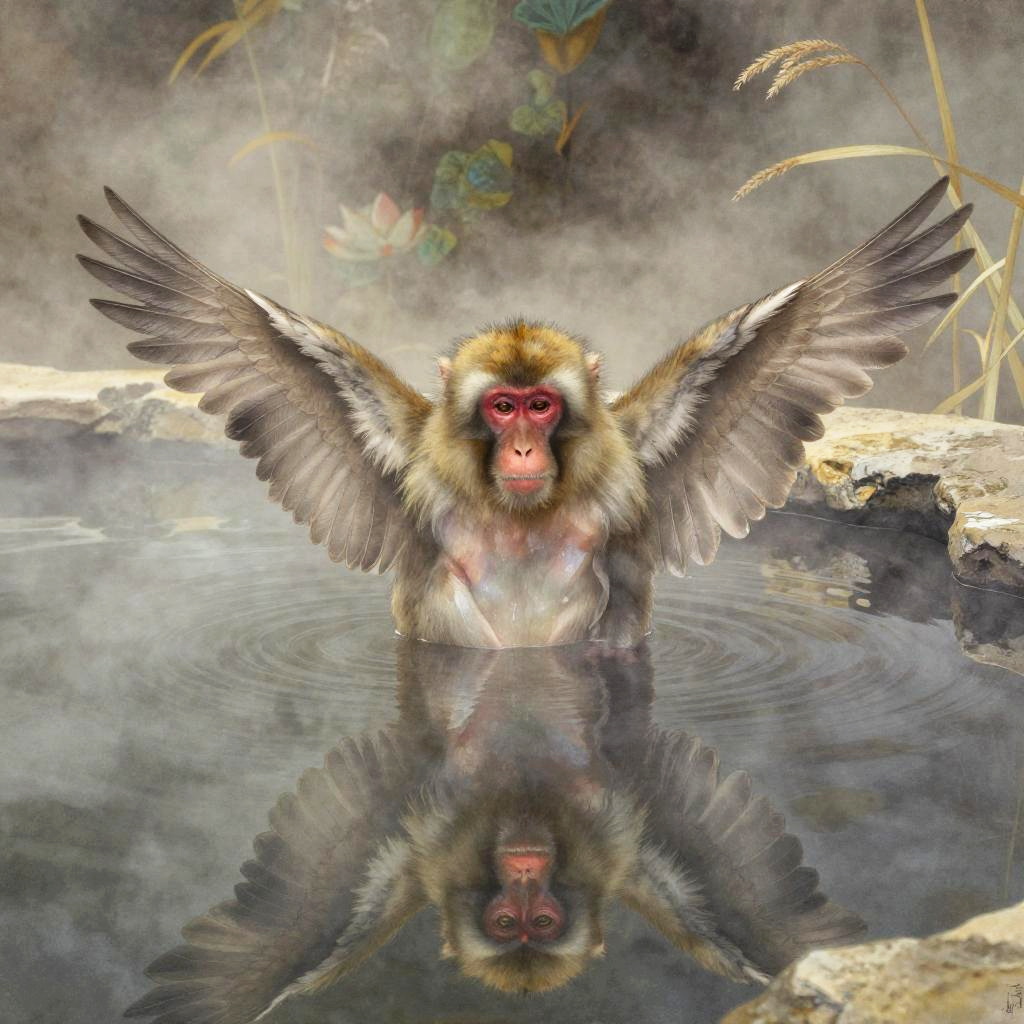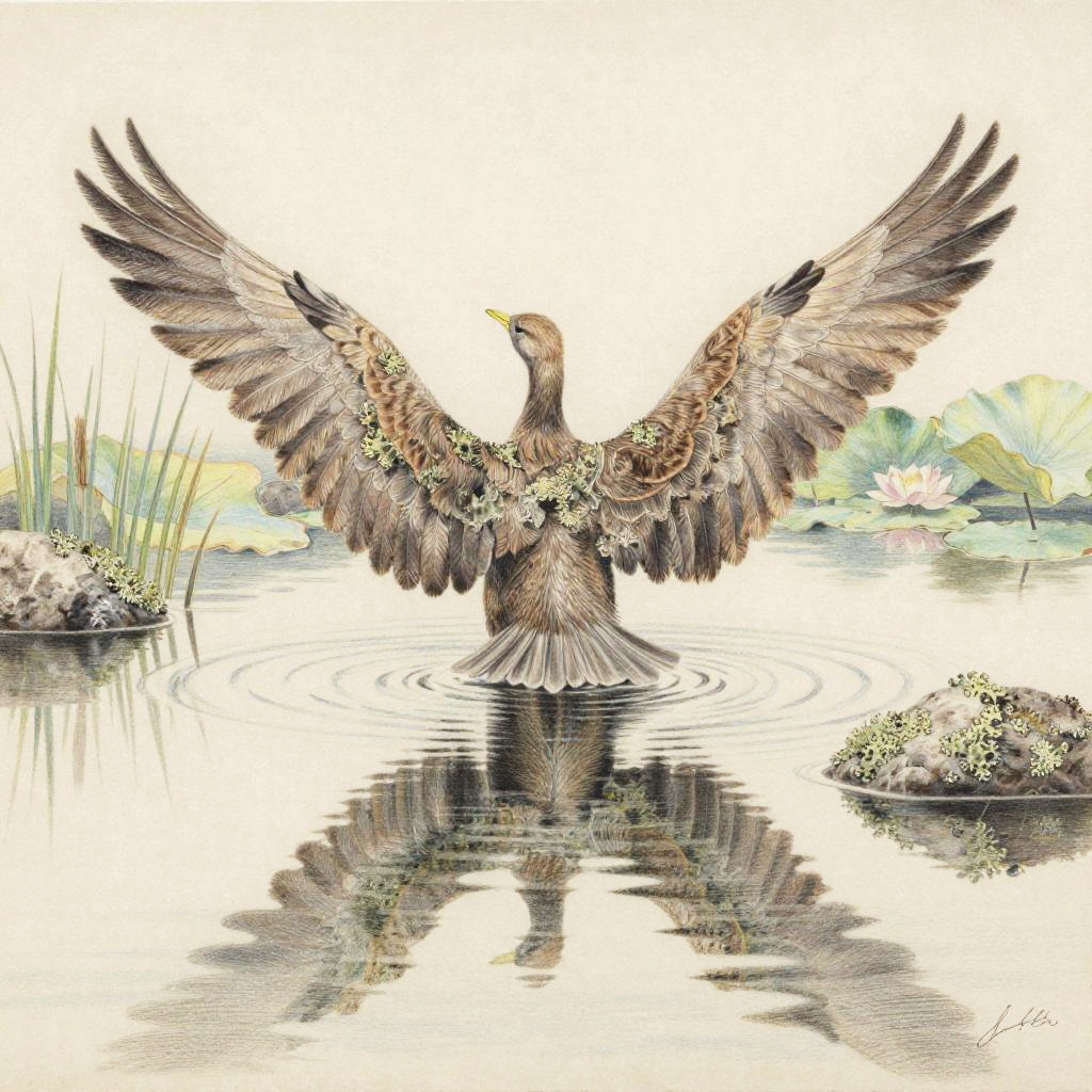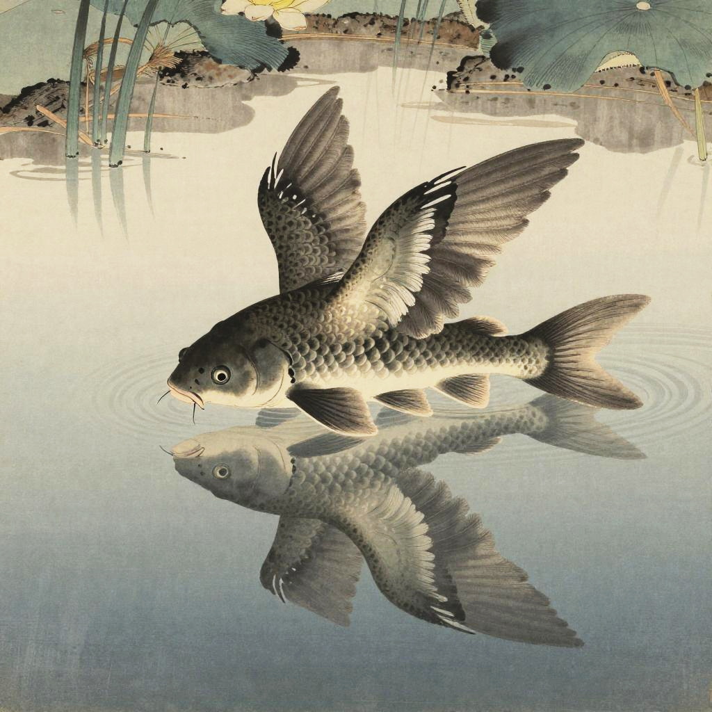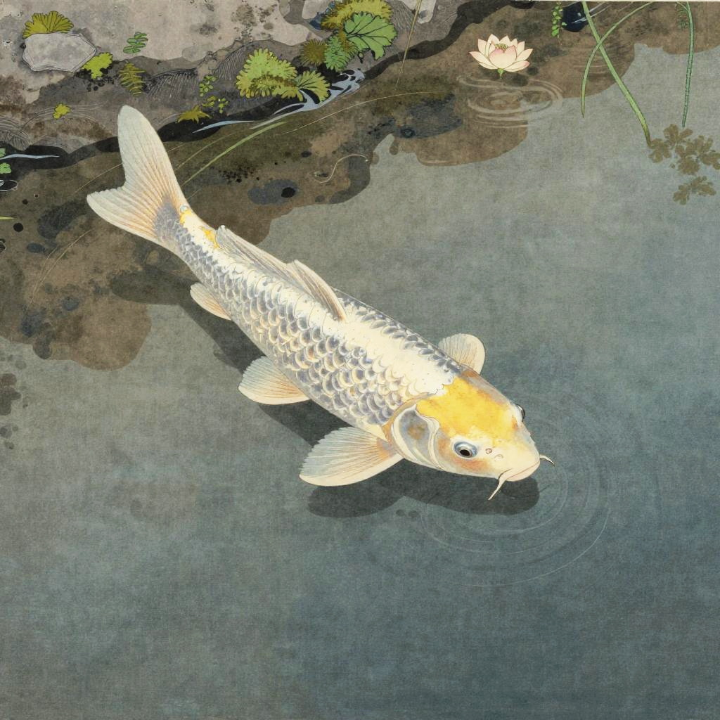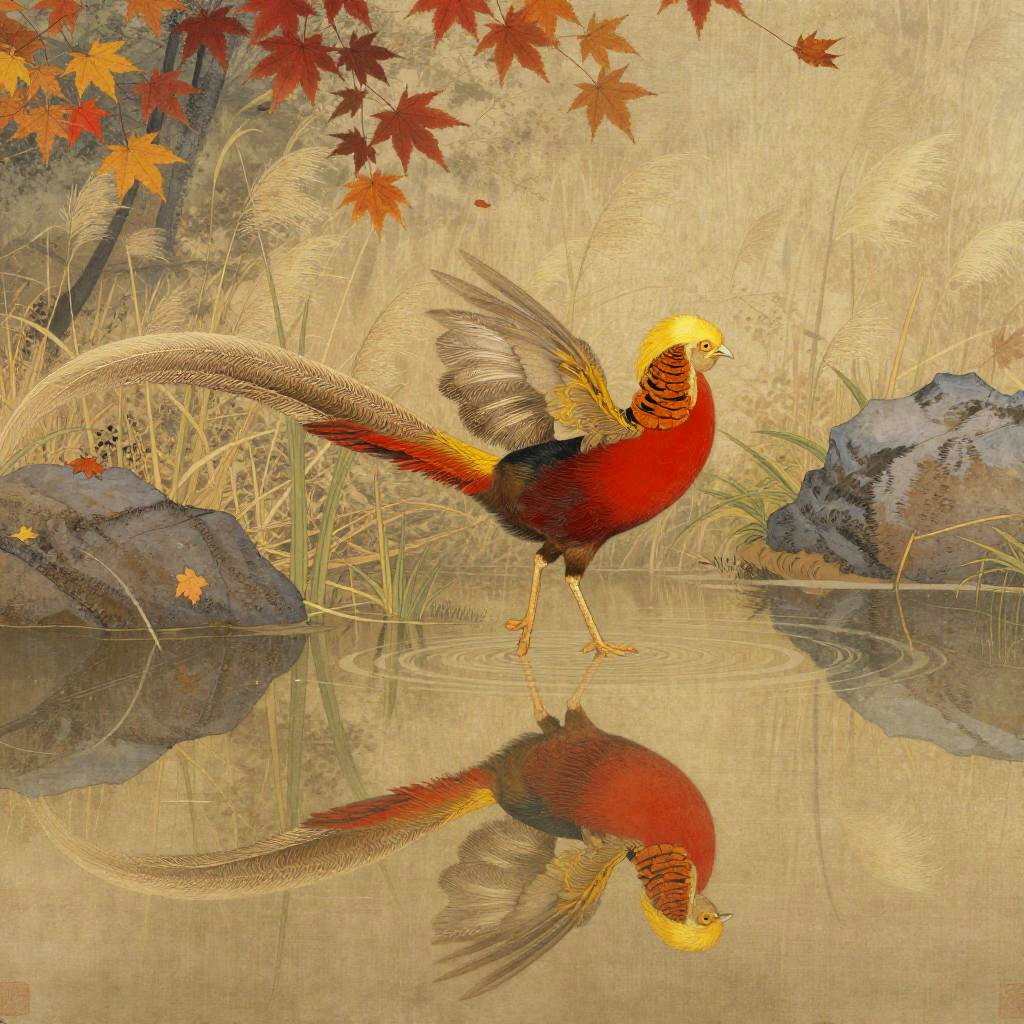 Jade turtle in quiet oasis pond with lotus and reeds, calm water with ripples, full body and clear reflection, wings fully spread, intricate feather detail. Traditional media: Chinese ink and watercolor on rice paper. Solo, animal focus, no humans, signature. Natural elements like reeds, lotus, or rocks, balanced symmetry, soft haze, gentle vignette, fine paper texture, painterly strokes, subtle highlights, tranquil composition, serene atmosphere, natural lighting, museum print feel.
