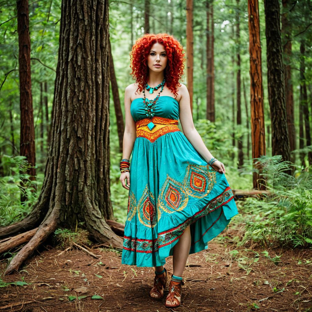 Full-body photograph of a woman with fair skin and vibrant red curly hair standing in a dense forest. She wears a strapless turquoise dress featuring intricate red, orange, and yellow patterns, complemented by matching ornate necklaces and wristbands. The setting is natural with large tree trunks and lush greenery, illuminated by soft natural daylight that enhances the ethereal, bohemian atmosphere.