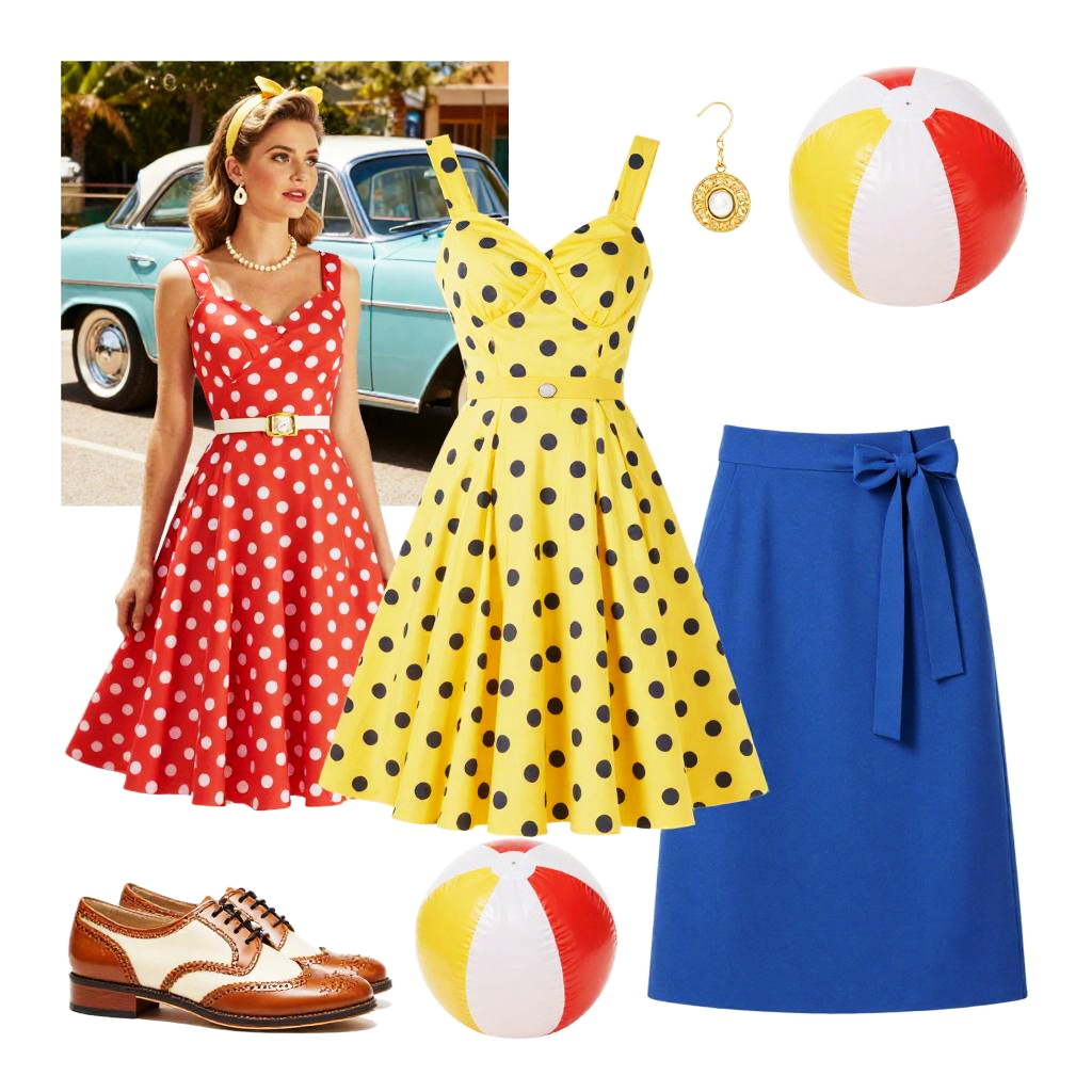 Stylish moodboard collage with a 1950s vintage summer, featuring polka dot sundresses and wingtip shoes. The background includes classic cars and retro beach balls to add a natural touch. The color palette is bold and colorful, with a high-fashion editorial style. Layered images create a cohesive and visually captivating moodboard, blending vibrant colors with carefully curated fashion elements for an inspiring, trend-focused design.