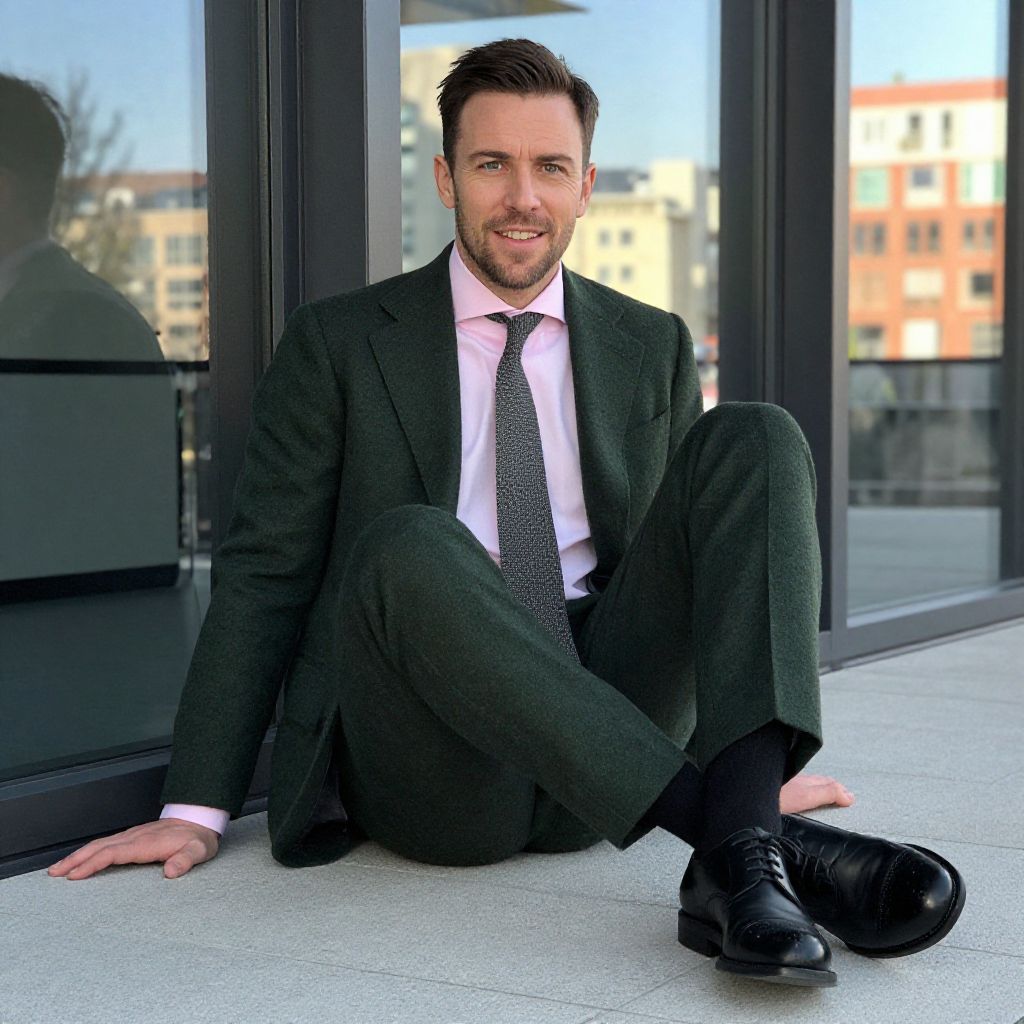 A man, dark green wool suit, pale pink dress shirt, textured gray tie, black leather derby shoes, sleek modern architecture, candid shot, relaxed smile, vibrant city views. Man has masculine face and piercing eyes