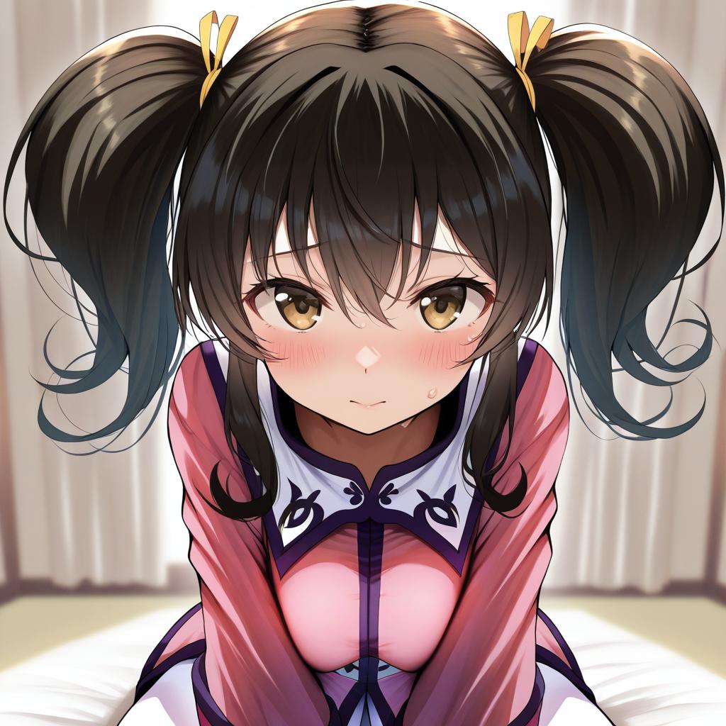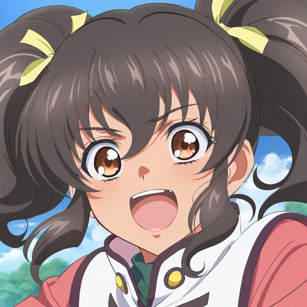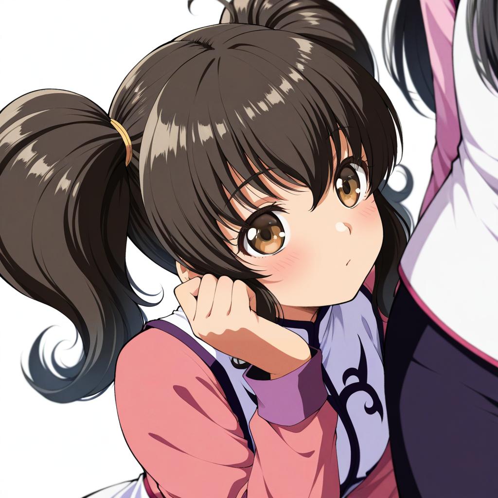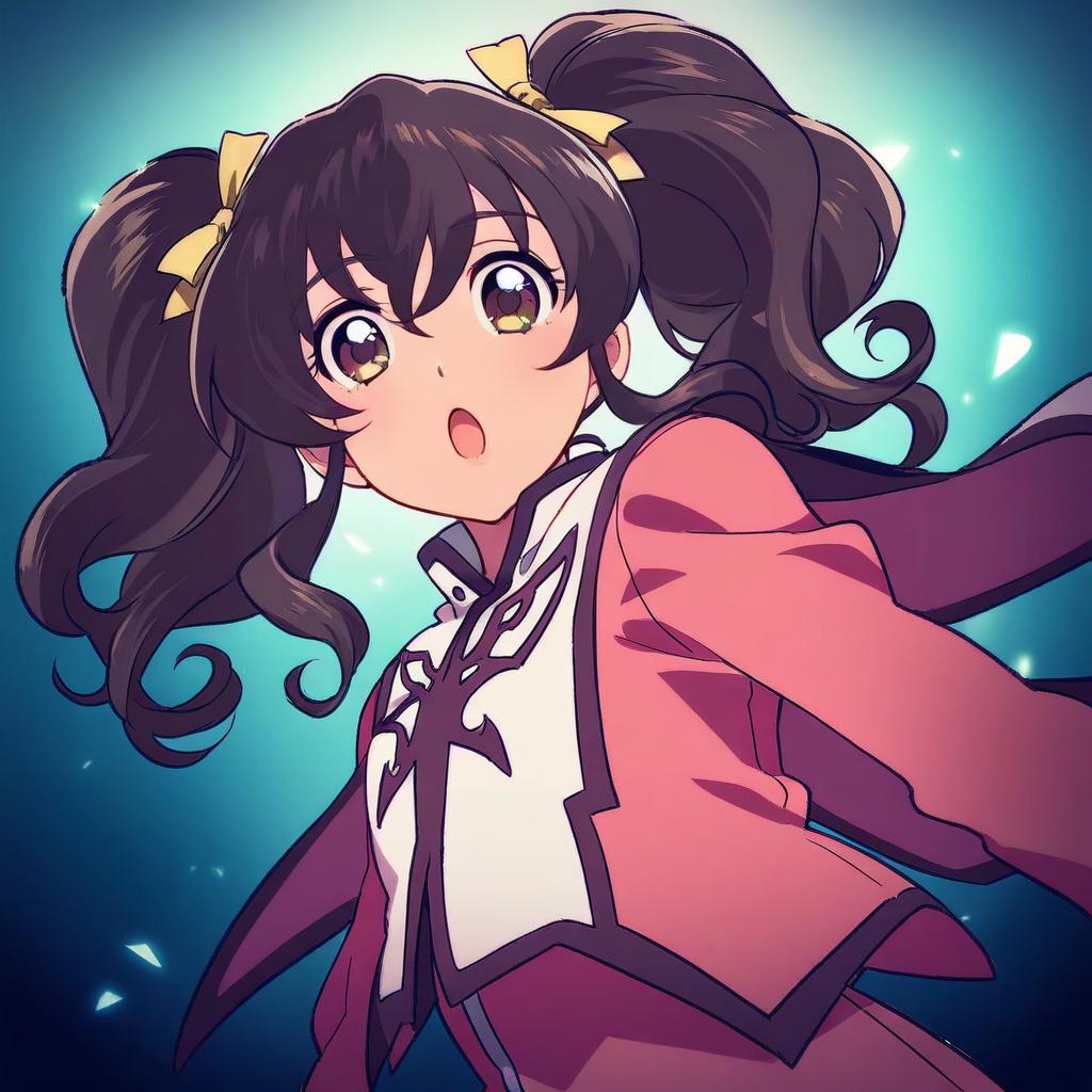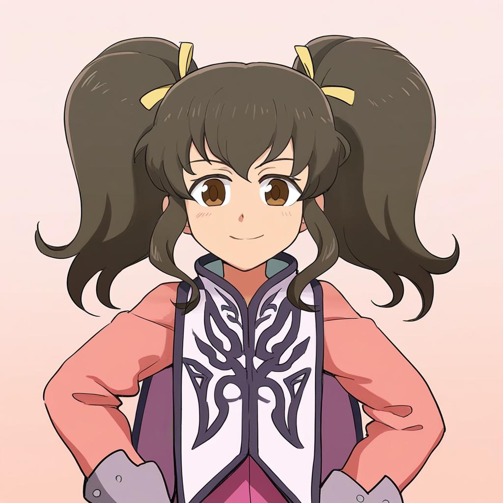 Anise tatlin, tales of (series), 1girl, brown eyes, brown hair, black hair, long hair, twintails, by artist yumiya, animagine