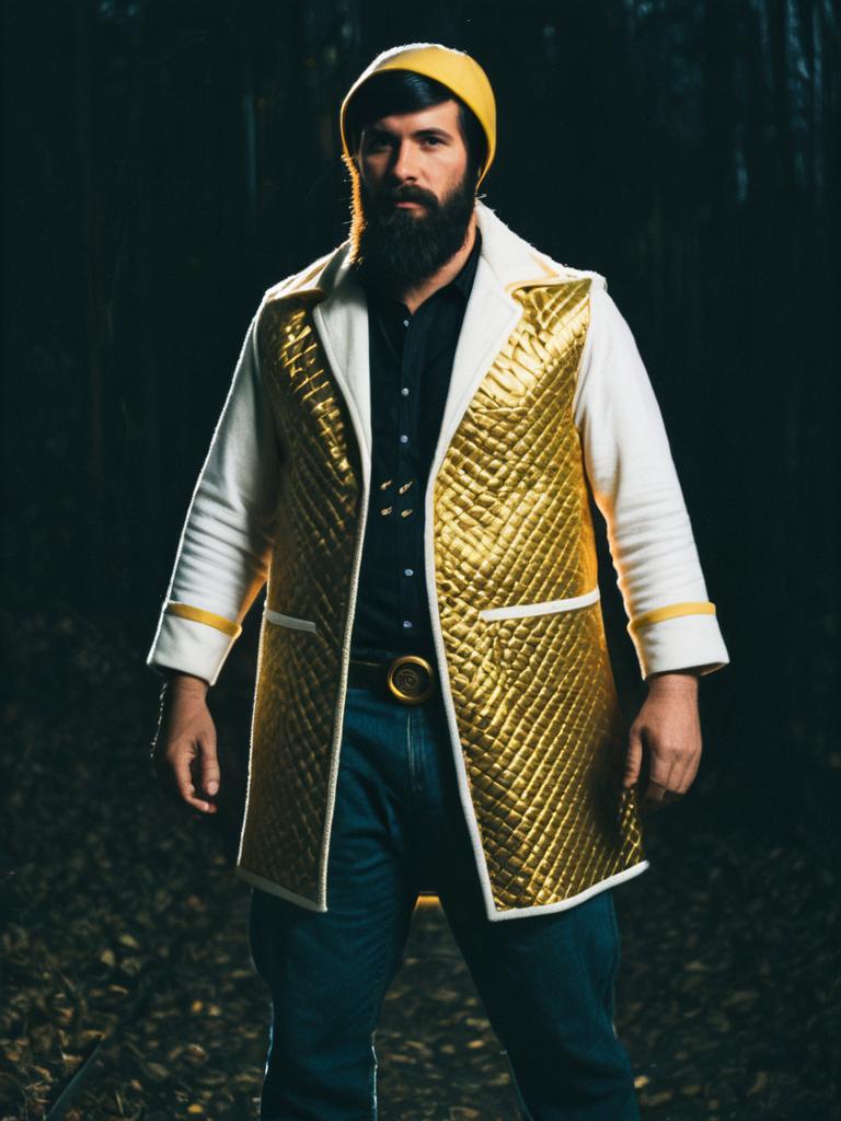 Full-body portrait of a young man with a beard wearing a brown cowboy hat, leopard print coat with fur collar, grey shirt and pants, brown leather belt, and brown leather shoes standing against a plain grey background.