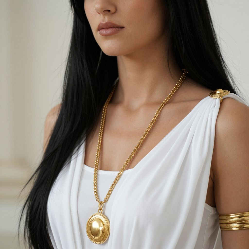 Ancient greek cosplay, a close up of a woman in a white dress with a gold necklace