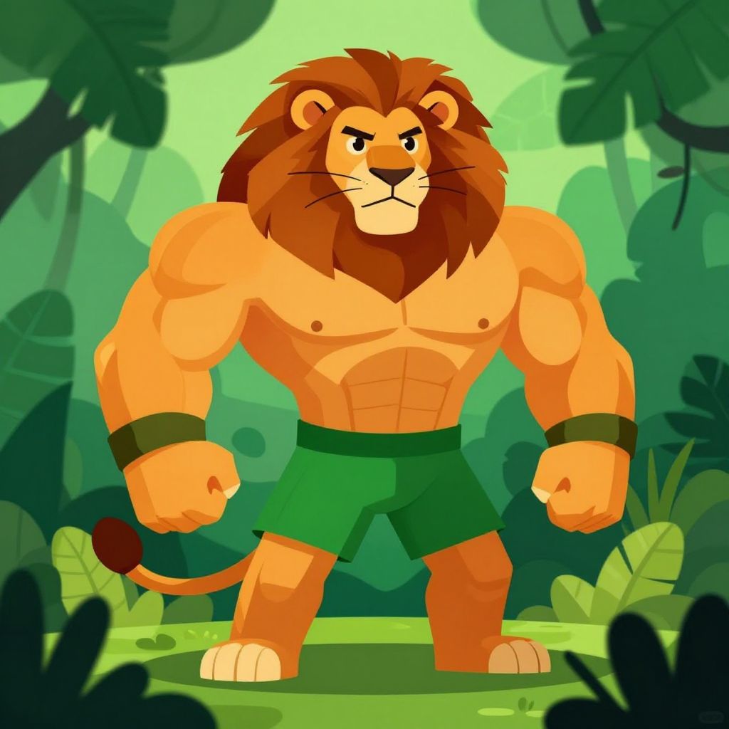 Cartoon-style illustration of a muscular, anthropomorphic lion with a brown mane, wearing green shorts, standing in a vibrant jungle.