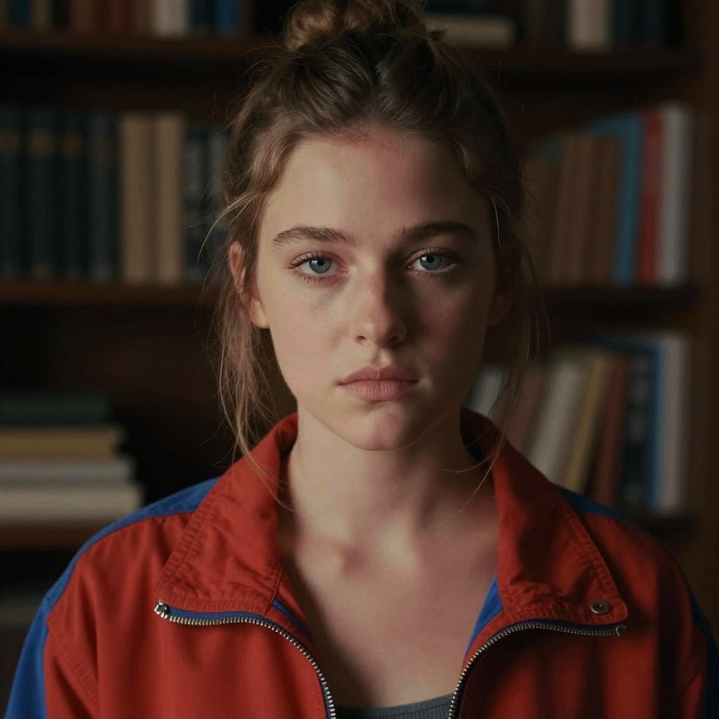(close-up, editorial photograph of a 21 year old woman britneyspears-smf, red blue jacket), (highly detailed face:1.4), (background inside dark, moody, private study:1.3), full body portrait, by lee jeffries, nikon d850, film stock photograph, 4 kodak portra 400, camera f1.6 lens, rich colors, hyper realistic, lifelike texture, dramatic lighting, cinestill 800