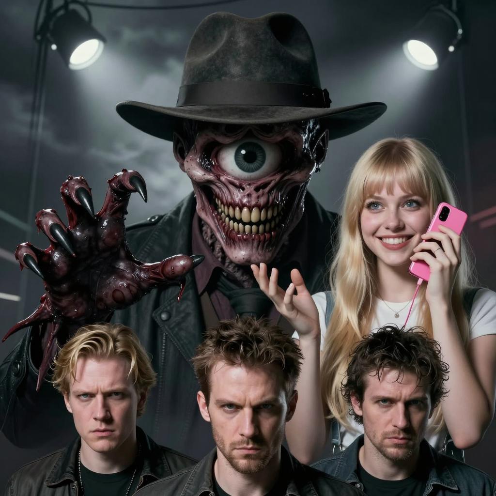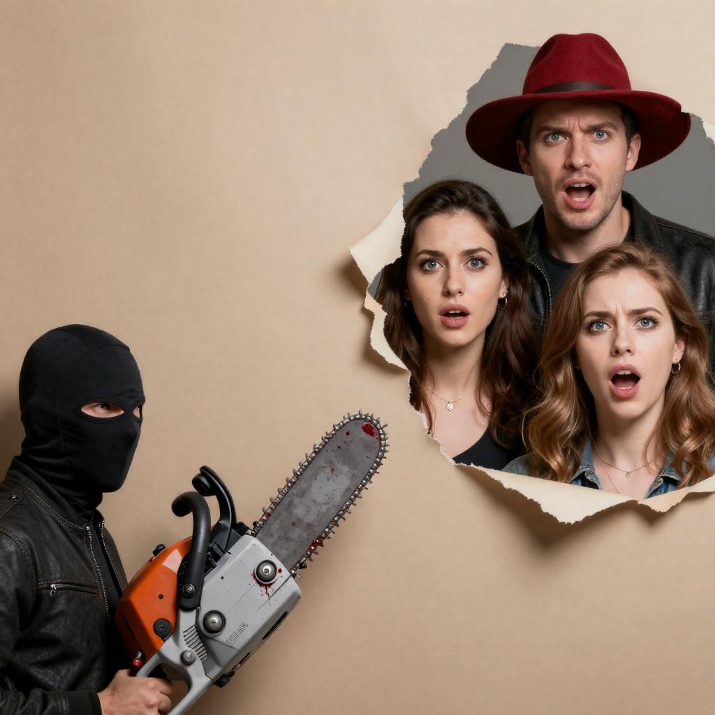 Photograph of a torn beige paper, right side shows intense expressions of four people, top right man in red hat, below two women, bottom left masked man, gray chainsaw with blood splatters, partial paper edge on left.