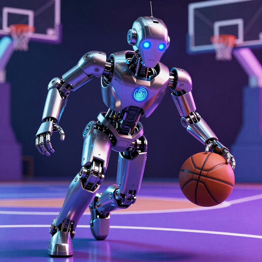 Lebron AI depicted as a futuristic basketball robot, sleek metallic design, glowing blue eyes, dribbling a high-tech smart basketball on a neon-lit court, dynamic energy, cybernetic details