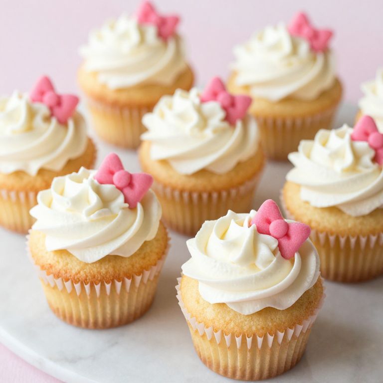 This is a close-up photograph of seven decorated cupcakes arranged in a slightly scattered pattern on a white surface. Each cupcake has a light brown, fluffy base with a white swirl of creamy frosting on top. Adorning the frosting are small, pink, heart-shaped decorations, adding a touch of sweetness and color. The cupcakes are in white, ridged paper liners, highlighting their golden-brown texture. The background is softly blurred, keeping the focus on the cupcakes. The overall image has a bright, clean, and inviting feel, with a focus on the cupcakes' decorative and delicious appearance.