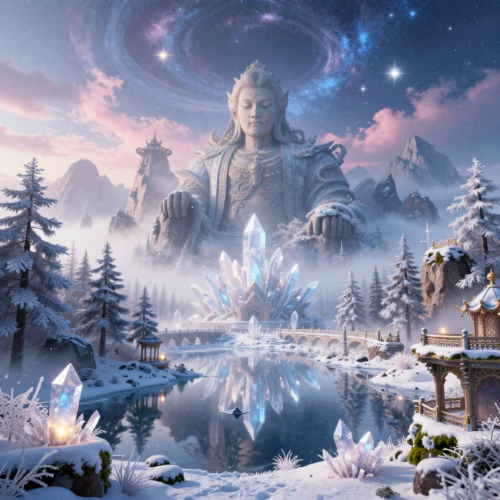 A colossal mountain giant resting amidst shards of crystal set within snowy alpine valley dotted with frost-laden pines and frozen lakes, wrapped in ethereal mist and drifting incense, glowing stars scattered above, a celestial vault painted with pale dawn colors with subtle pinks and blues blending into icy haze. Tranquil waters mirror the heavens, distant spires and bridges on rocky arches, lantern-lit sanctuaries and mossy terraces, a serene dreamlike atmosphere with surreal, intricate details; cinematic composition, volumetric fog and light rays, hyper-detailed textures, high dynamic range, wide-angle vista, depth of field, soft rim light, subtle film grain, epic scale.