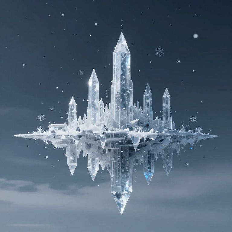 Digital artwork of a crystalline ice castle with tall, translucent spires reflecting on a calm, starry, blue-toned water surface.