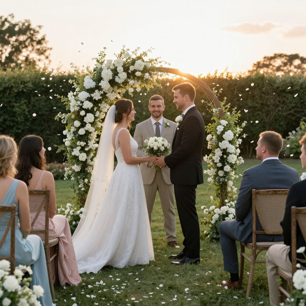 Photograph of an outdoor wedding ceremony at sunset. The bride, in a white lace gown and veil, and the groom, in a black suit and white tie, stand under a floral arch adorned with white flowers. They hold hands, facing each other. Guests, dressed in formal attire, sit on wooden chairs. The background features lush greenery and a golden sunset. The bride and groom are centered, with the arch behind them. White petals are scattered on the grass, adding a romantic touch. The image captures a warm, intimate moment with soft, natural lighting.