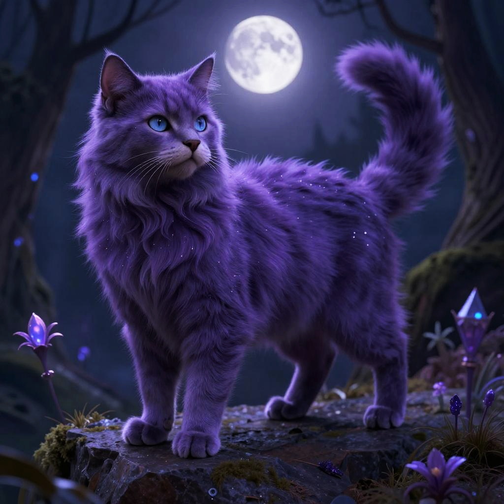 Photograph of an orange tabby cat with vivid, glowing yellow eyes, sitting on a rocky surface at sunset. The cat's fur is thick and fluffy, with a prominent, curled tail. The background features a dramatic sunset with a golden sun partially obscured by purple and orange clouds, casting a warm, orange glow over the scene. The cat is centered in the frame, looking directly at the camera with a calm, focused expression. The rocky surface is dark gray, contrasting with the cat's bright fur. The overall image has a vibrant, colorful, and slightly surreal quality due to the intense lighting and colors.