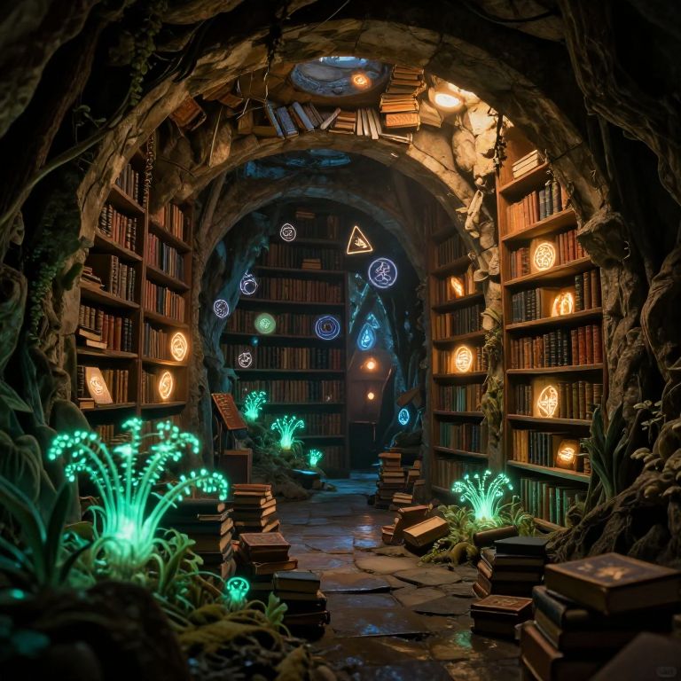 Photograph of a mystical, cave-like library with glowing orbs, neon plants, stacked books, and wooden shelves, illuminated by magical, ethereal lights