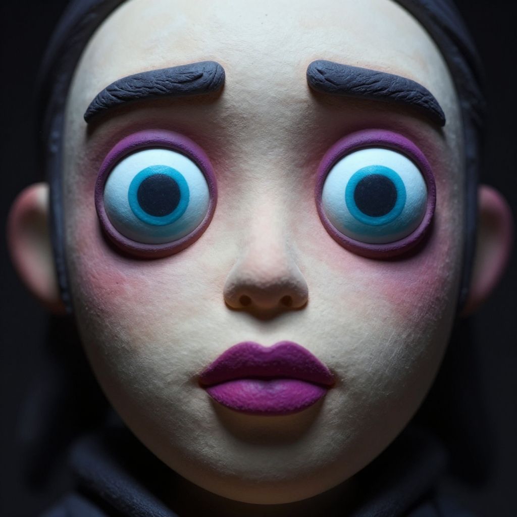 Close-up CGI portrait of a cartoonish character with large, wide blue eyes, thick black eyebrows, pale skin, and purple lips, set against a