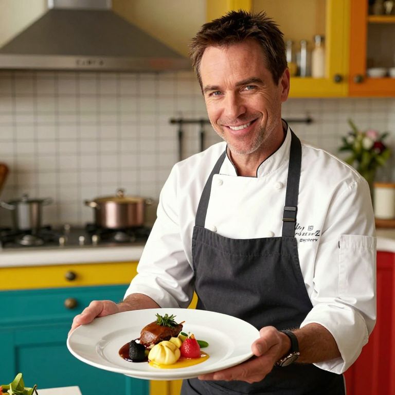 Jason Bourne a female chef smiling at camera presenting beautiful food on a plate, we see a bespoke colorful kitchen blurred in the background,