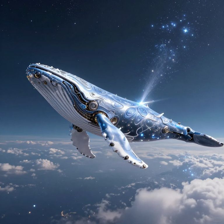 Gleaming mechanical whale glides gracefully through the starlit stratosphere, its ornate body adorned with intricate patterns as it expels a radiant stream of stardust from its mouth, illuminating the ethereal clouds below.